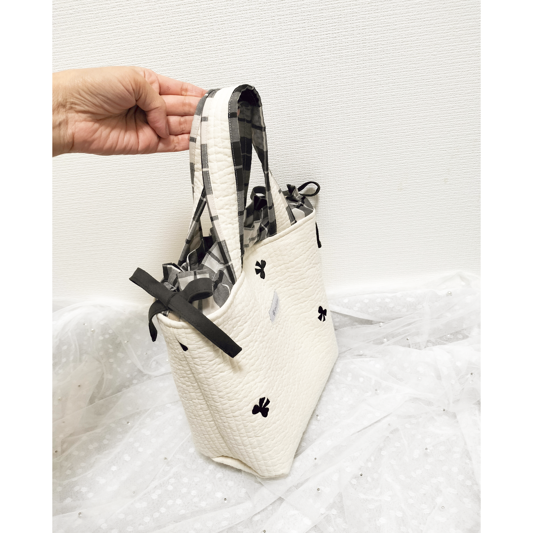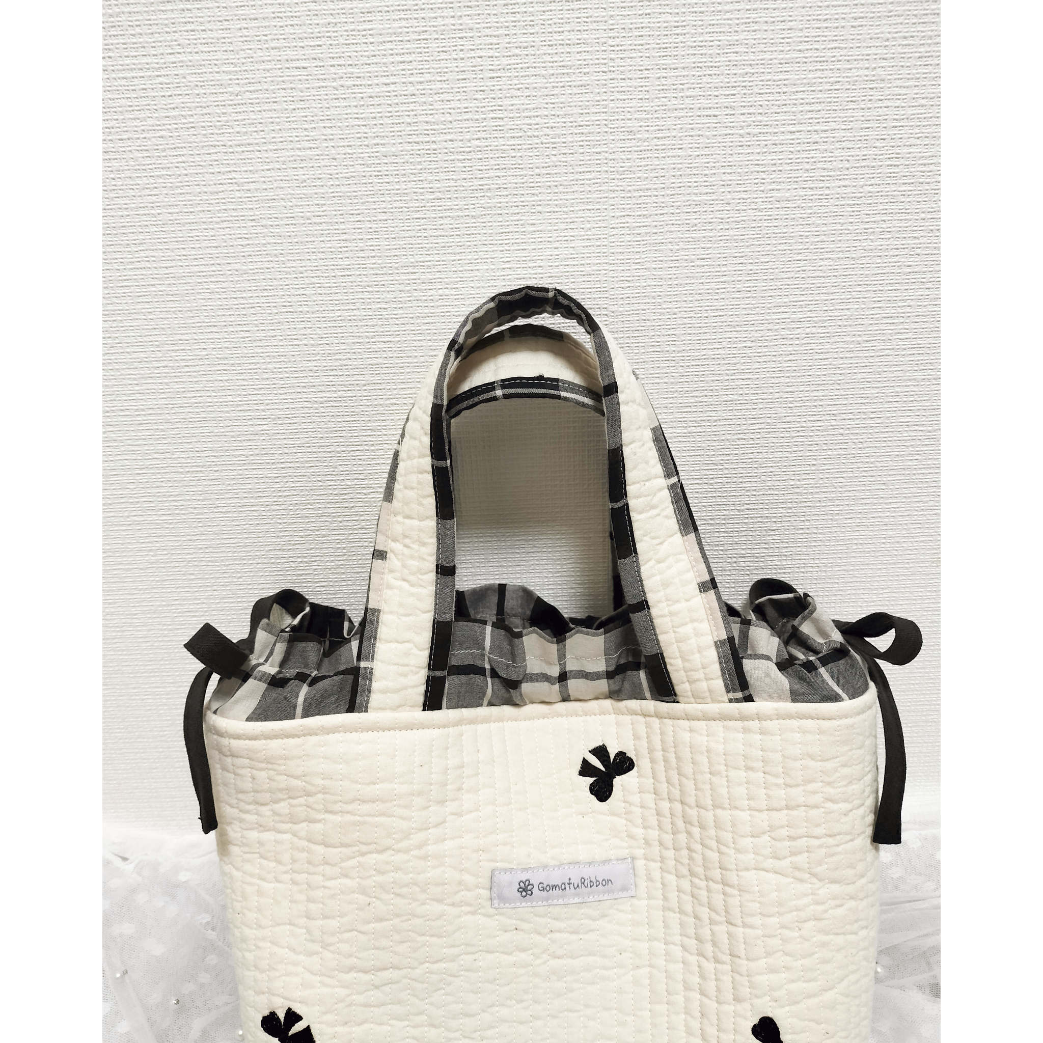 フリル巾着&サイドリボンのヌビトートバッグ アイボリーヌビ♡白黒チェック