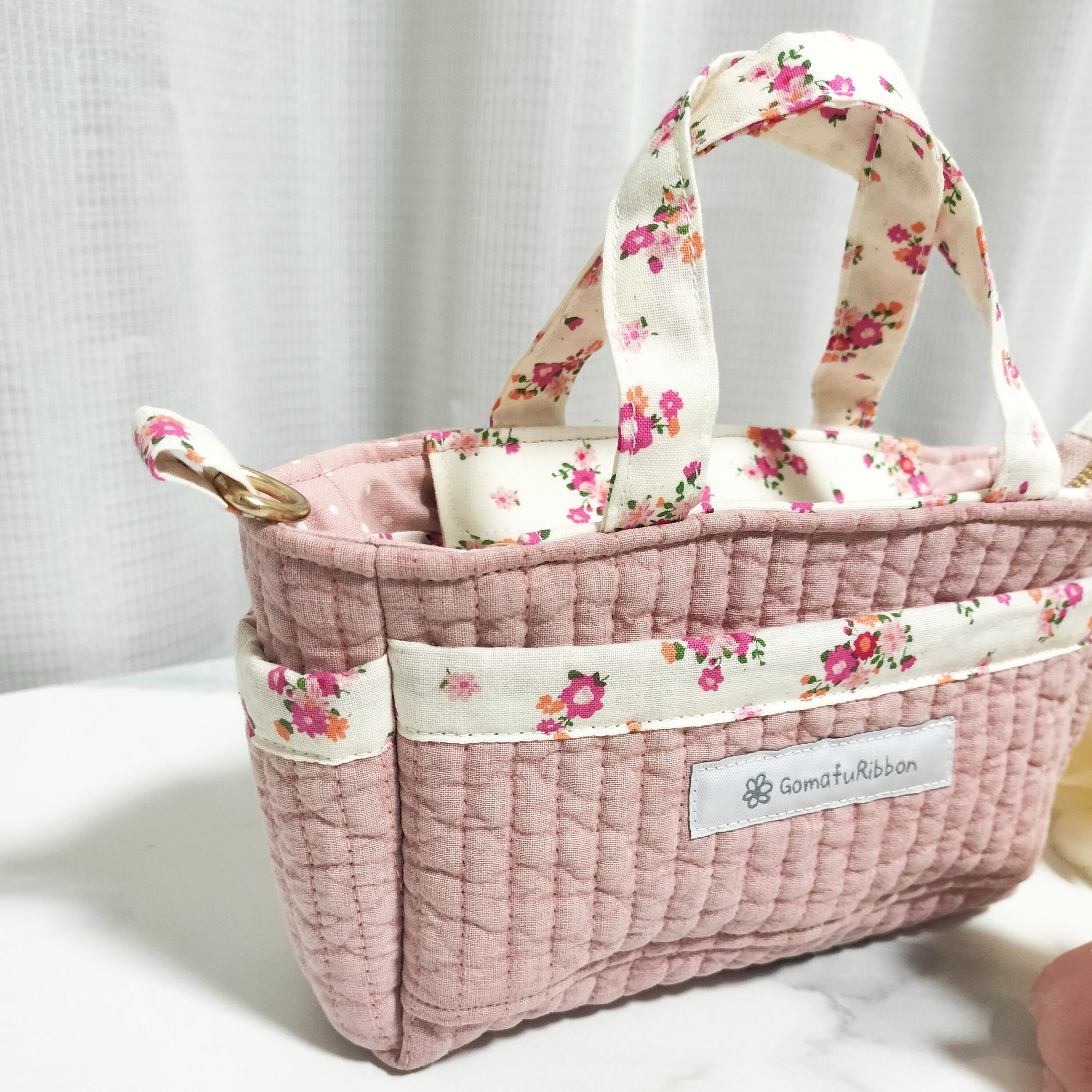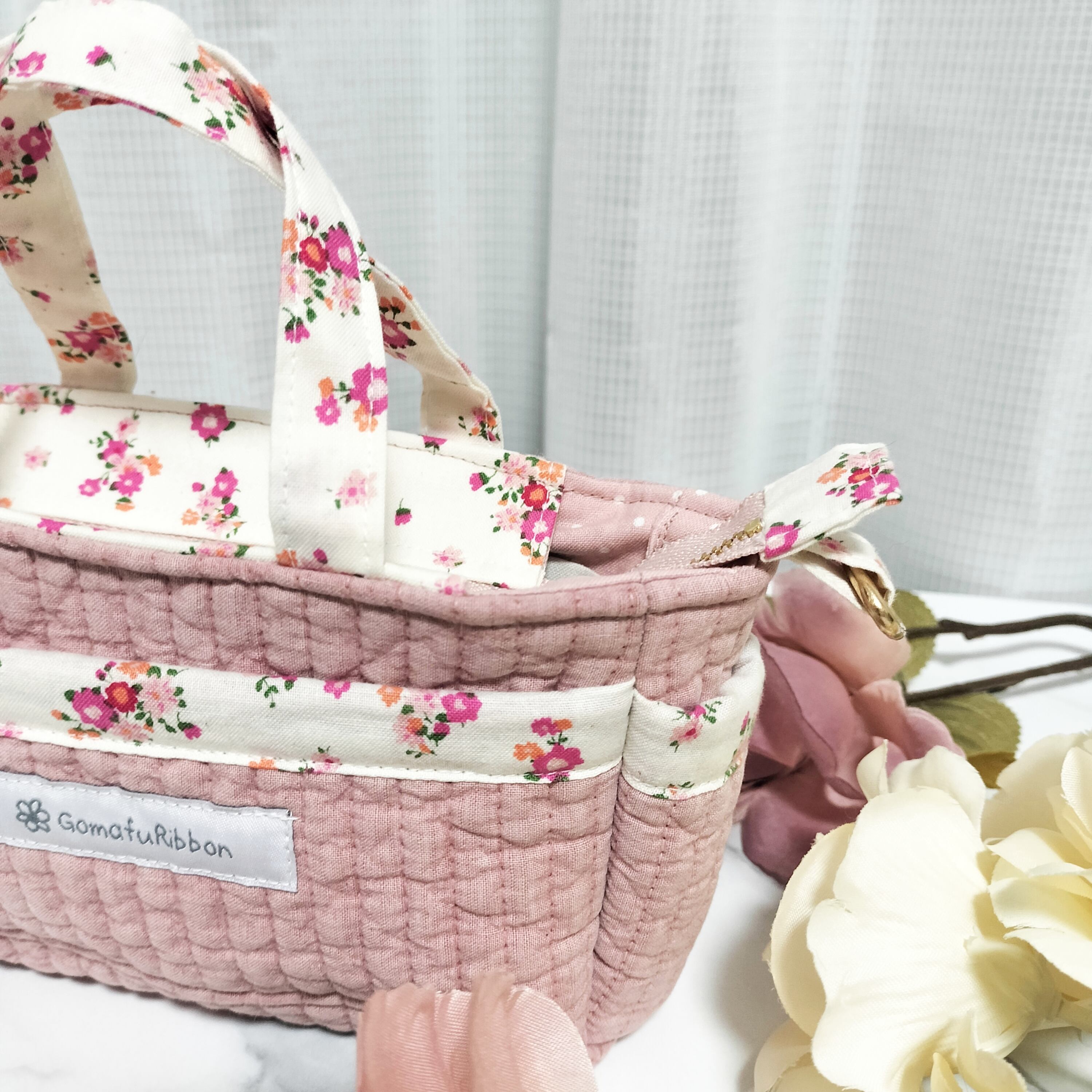 トートバッグ風ポーチ 桜色ヌビxピンク系小花(白地) Dカン付き