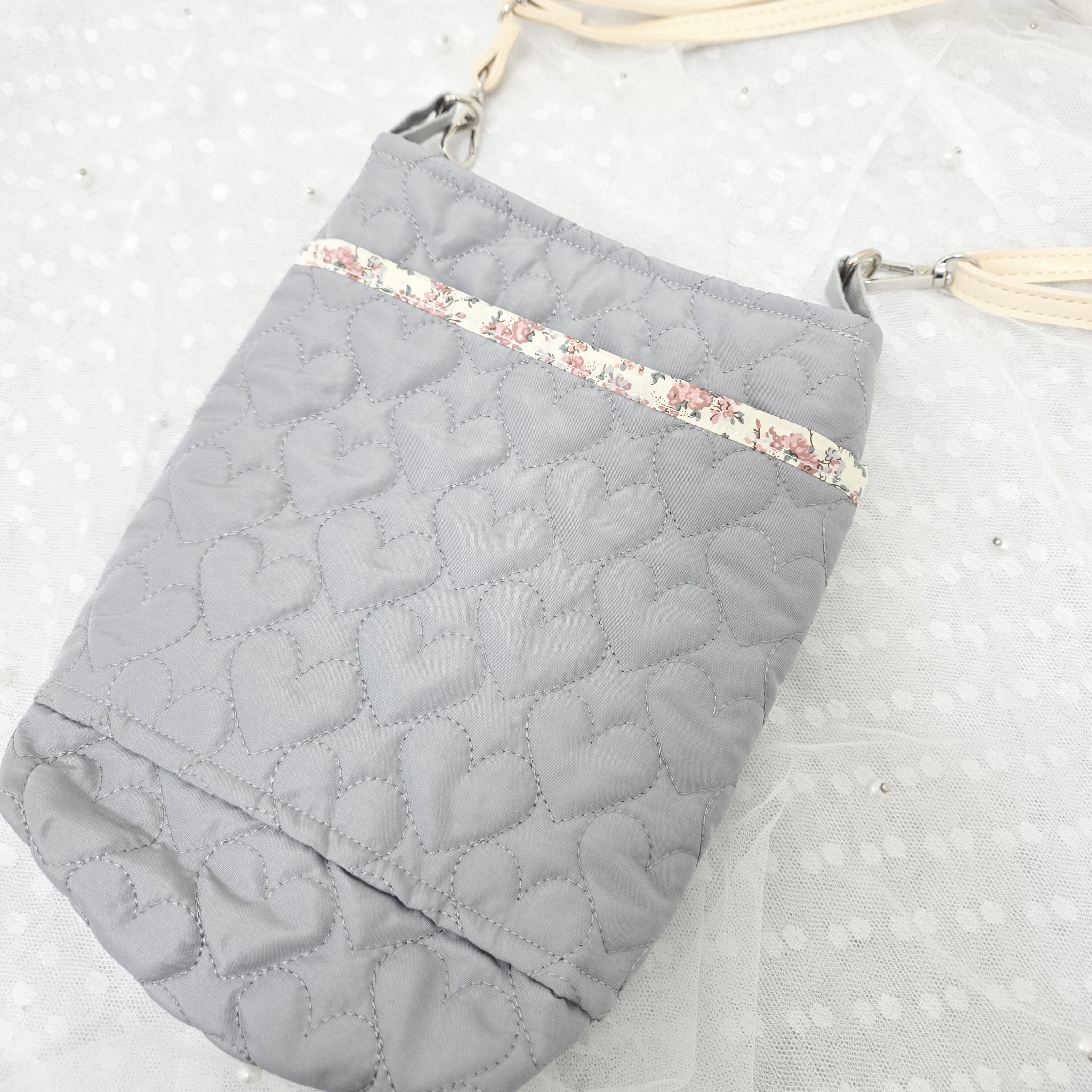 ハートキルティングとリバティのサコッシュ グレー ピンクの小花