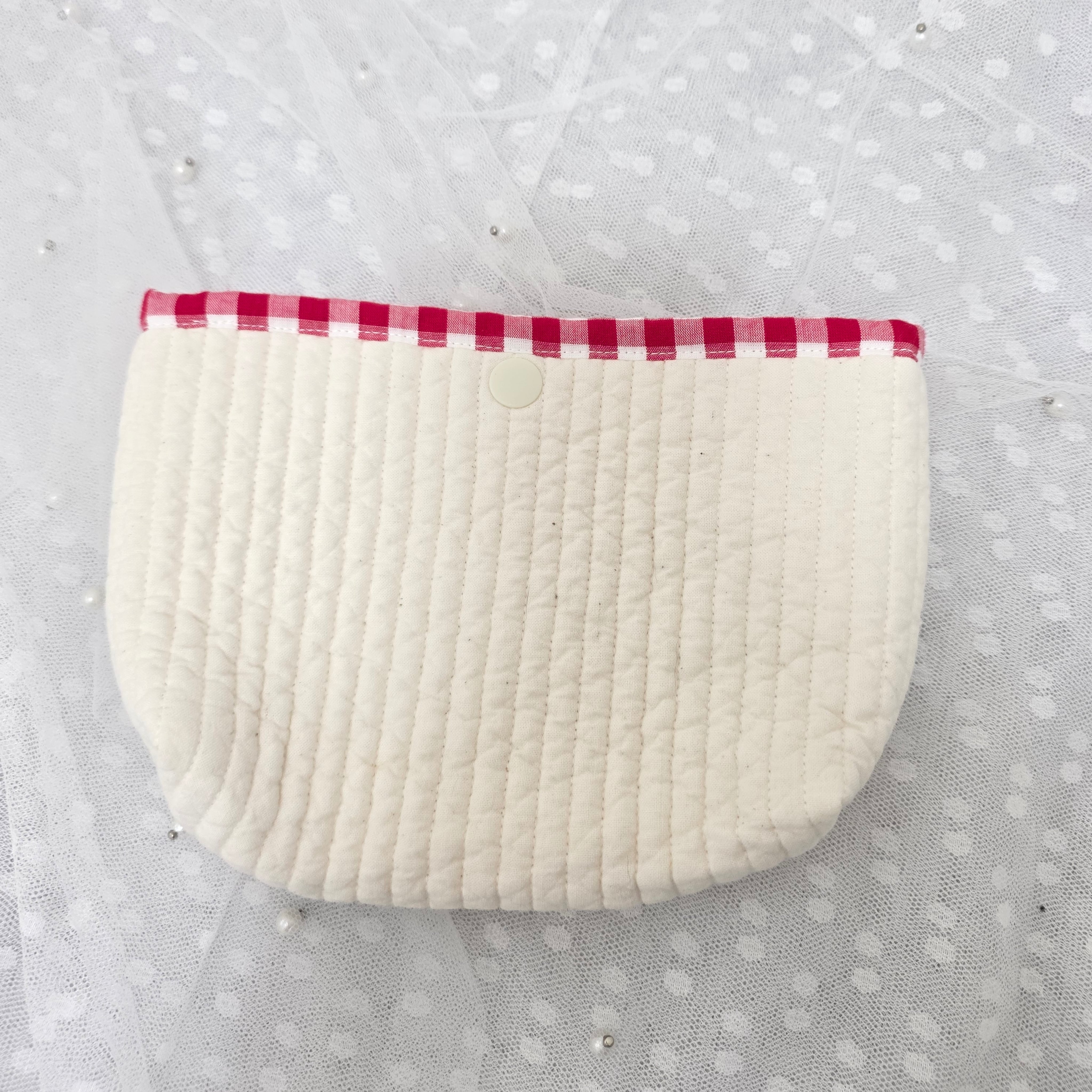このポーチは、かわいらしいギンガムチェックが目を引き、ほんわかヌビ素材が心地よいマイクロファイバーになっています。フロントには、トーションレースで作られたリボンがポイントとなり、シンプルながらも華やかな印象を与えます。スナップボタン式で開閉も簡単で、気軽に使えるサイズ感が魅力です。デイリーユースに最適で、小物をおしゃれに収納するのにぴったりです!