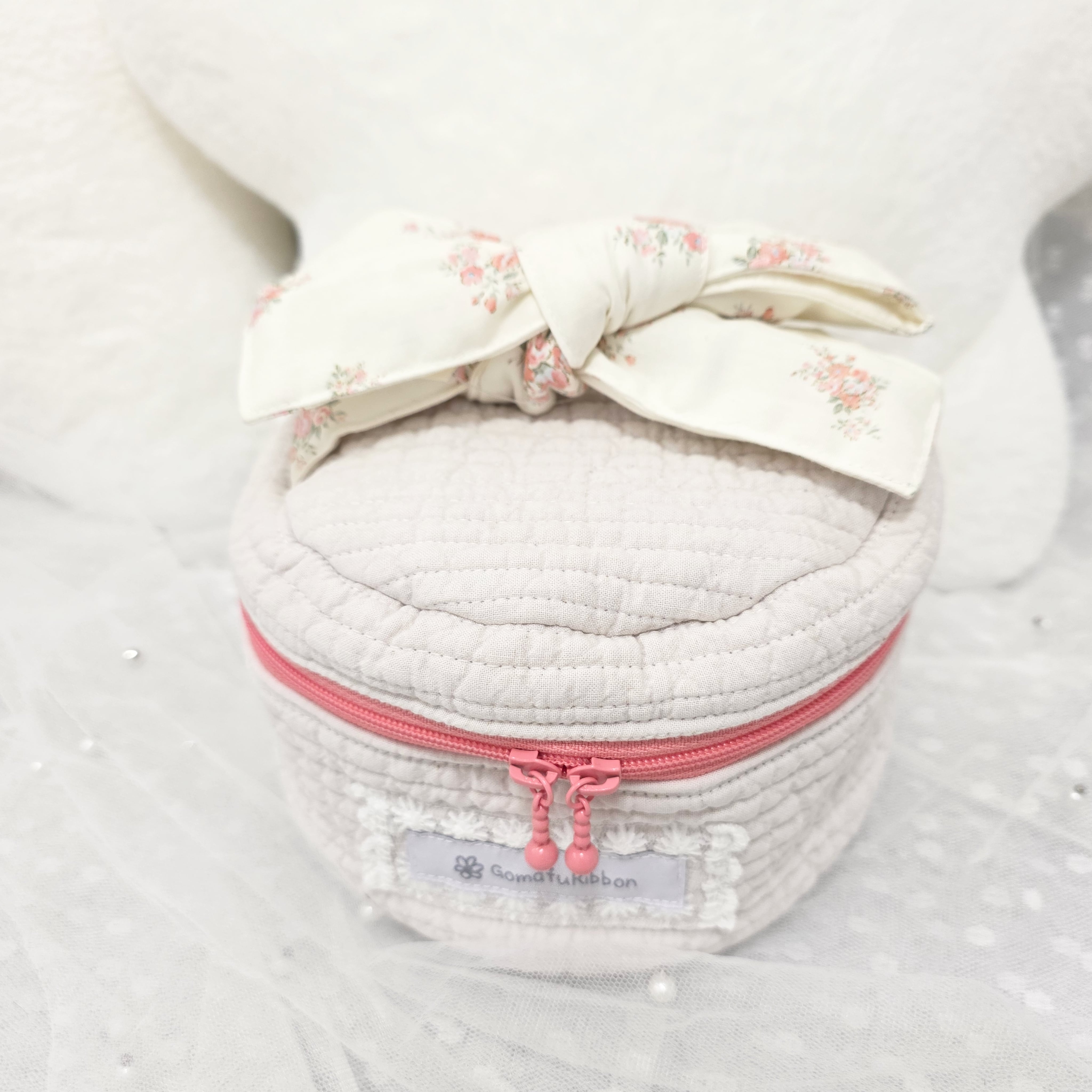 こちらはヌビ生地にふわふわリボンを合わせた、まあるいバニティポーチです♡