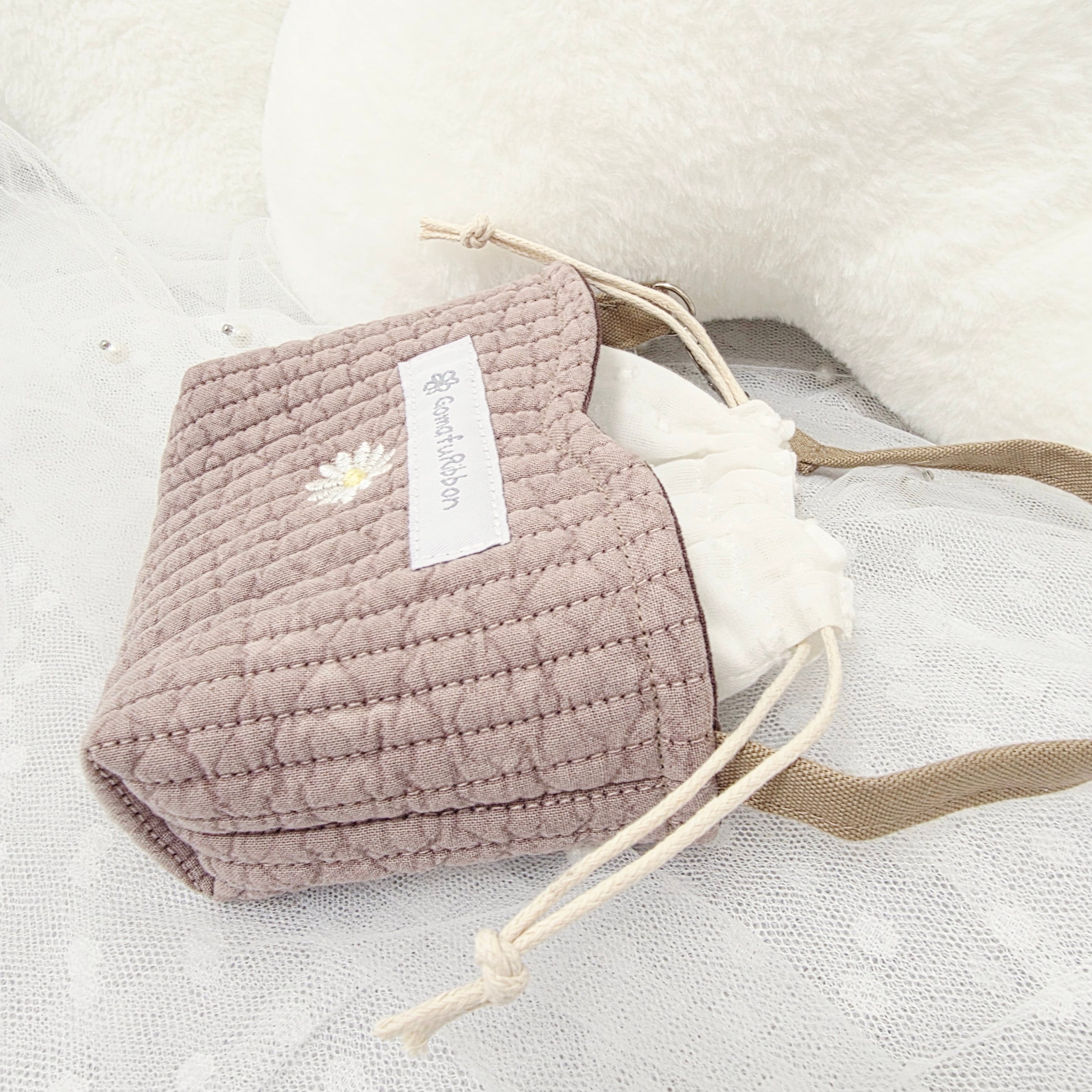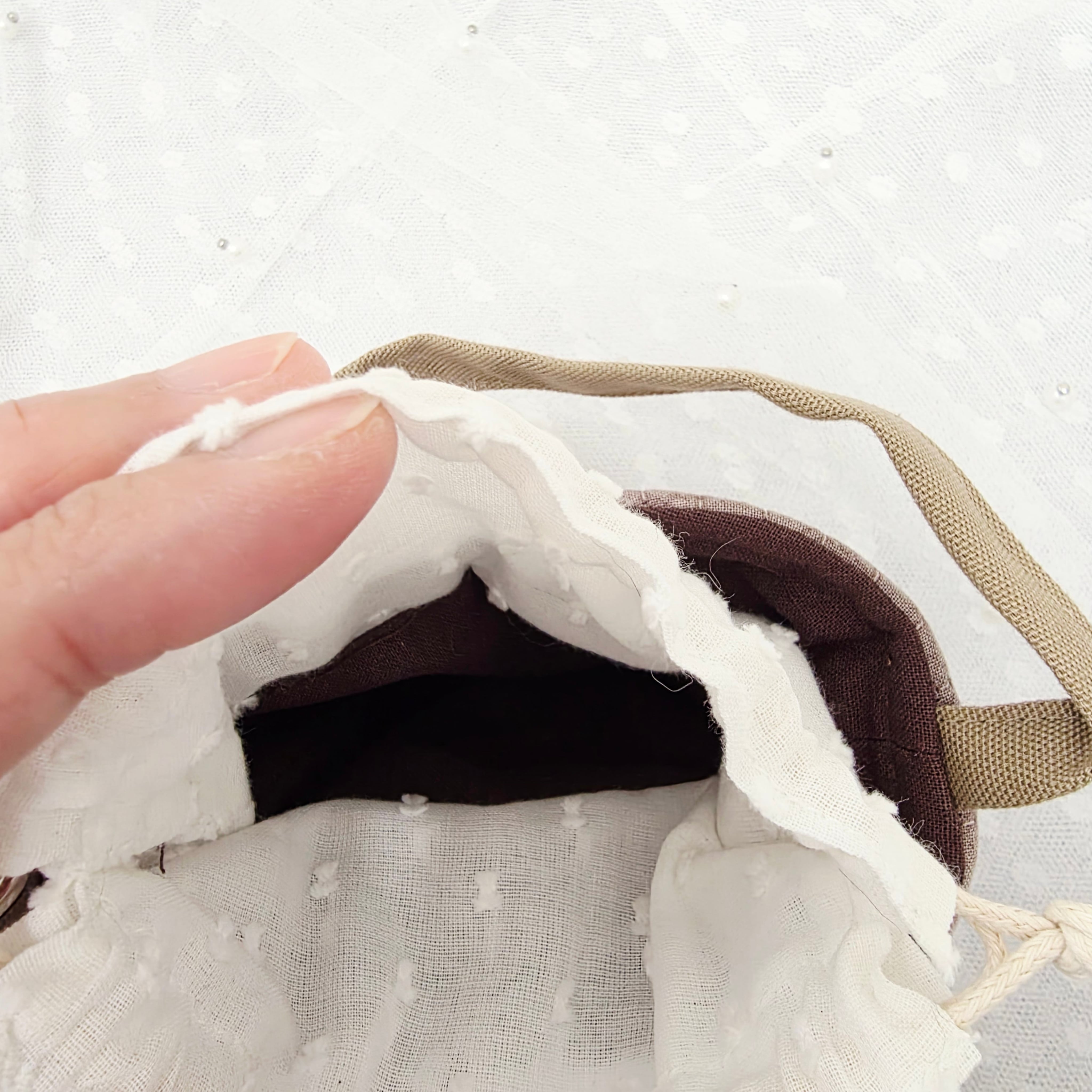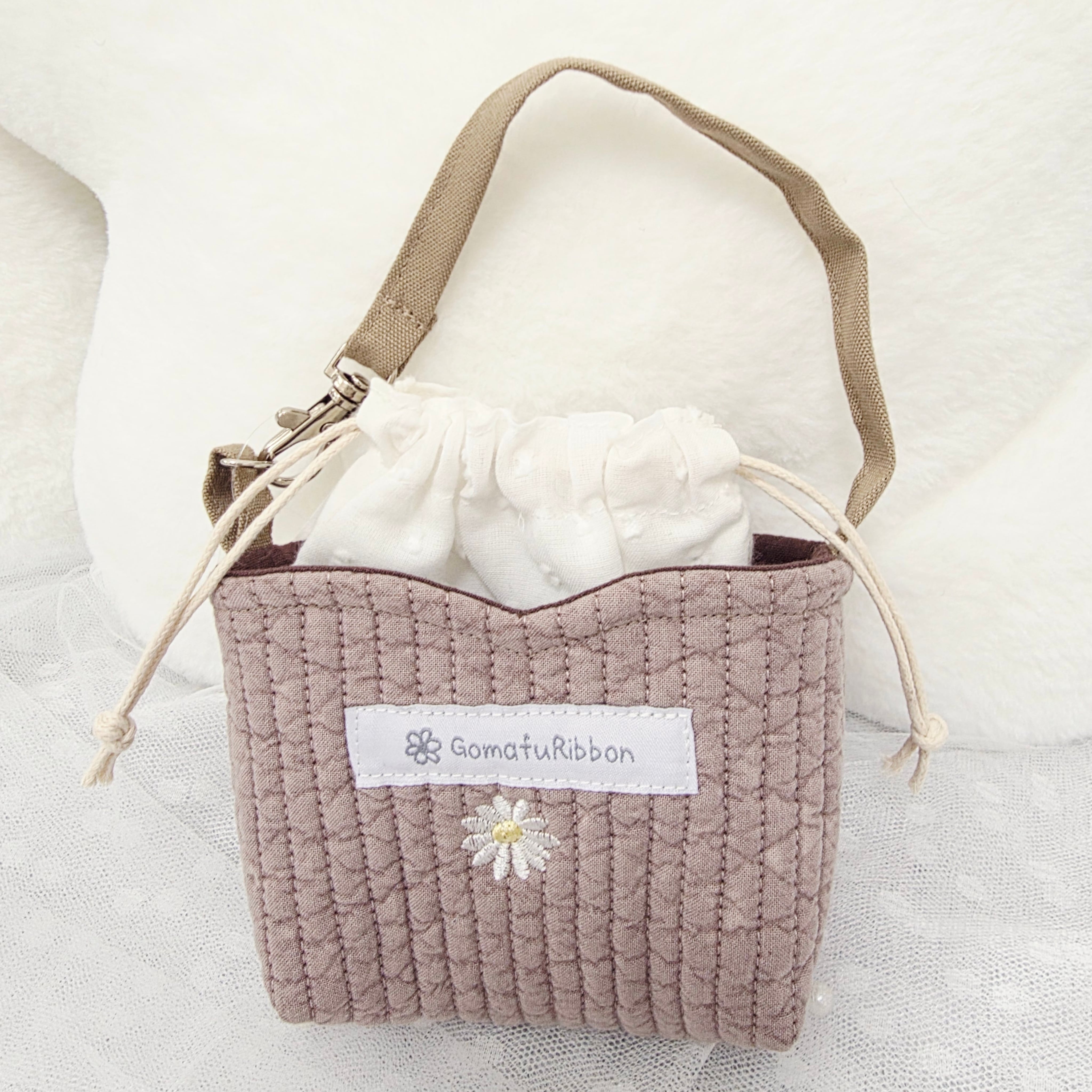 プリンセスカットのバッグチャームポーチ 巾着付き マーガレット刺繡のヌビ カフェオレブラウン
