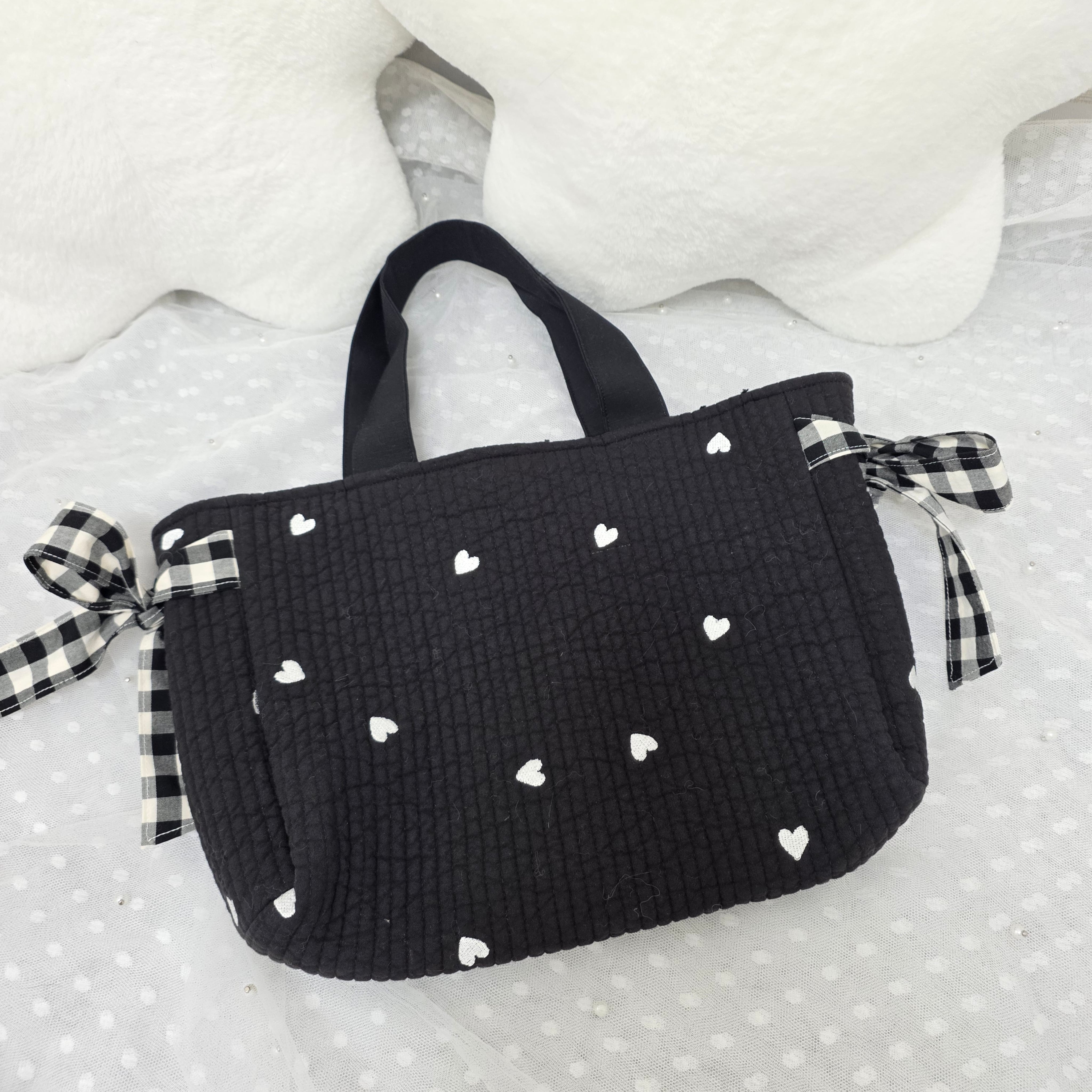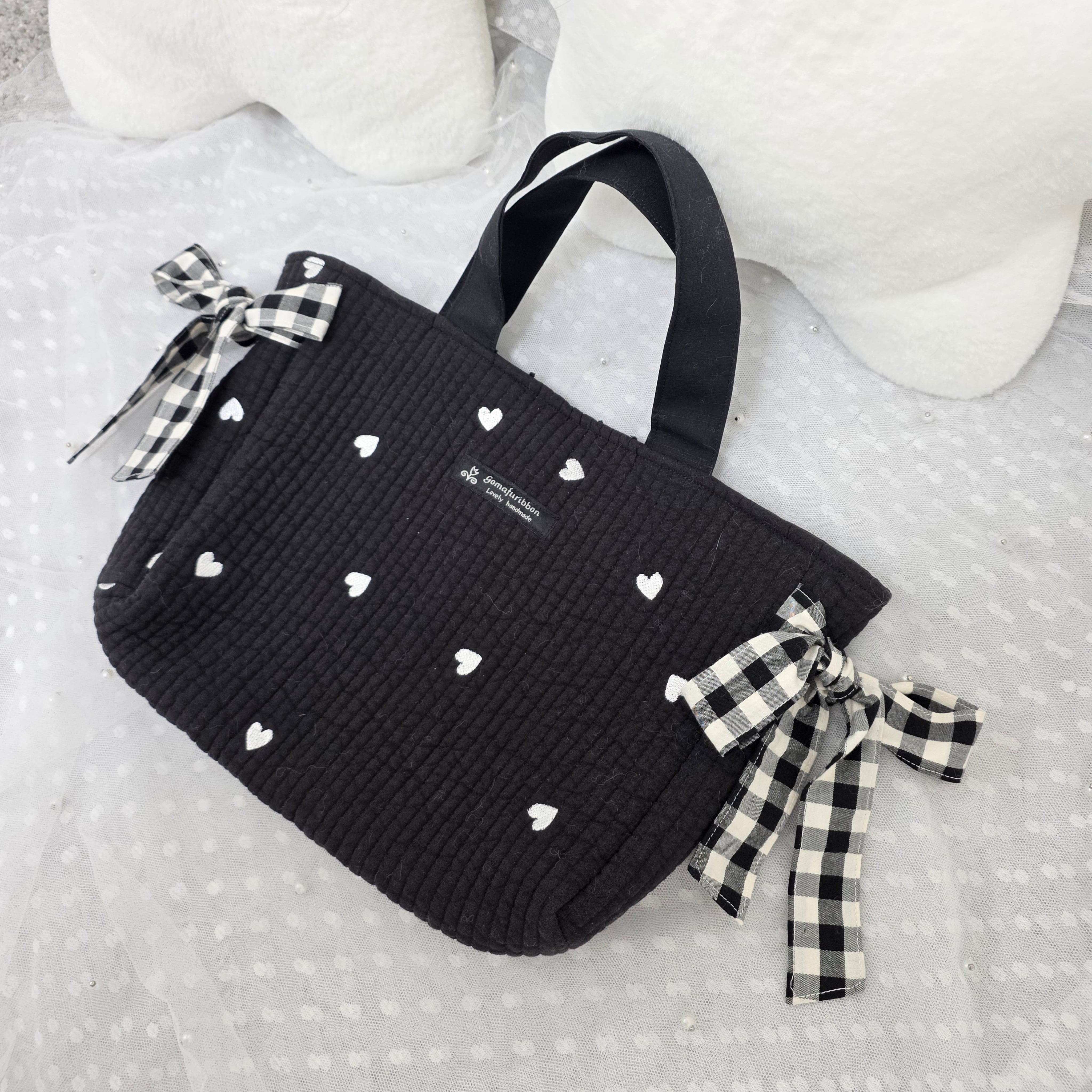 ギンガムチェックのサイドリボンが可愛い白いハート刺繍のヌビトートバッグです。