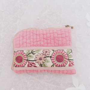 L字ファスナー財布 ベビーピンクヌビ&インド刺繍リボン(ホワイトリボン ピンクフラワー)