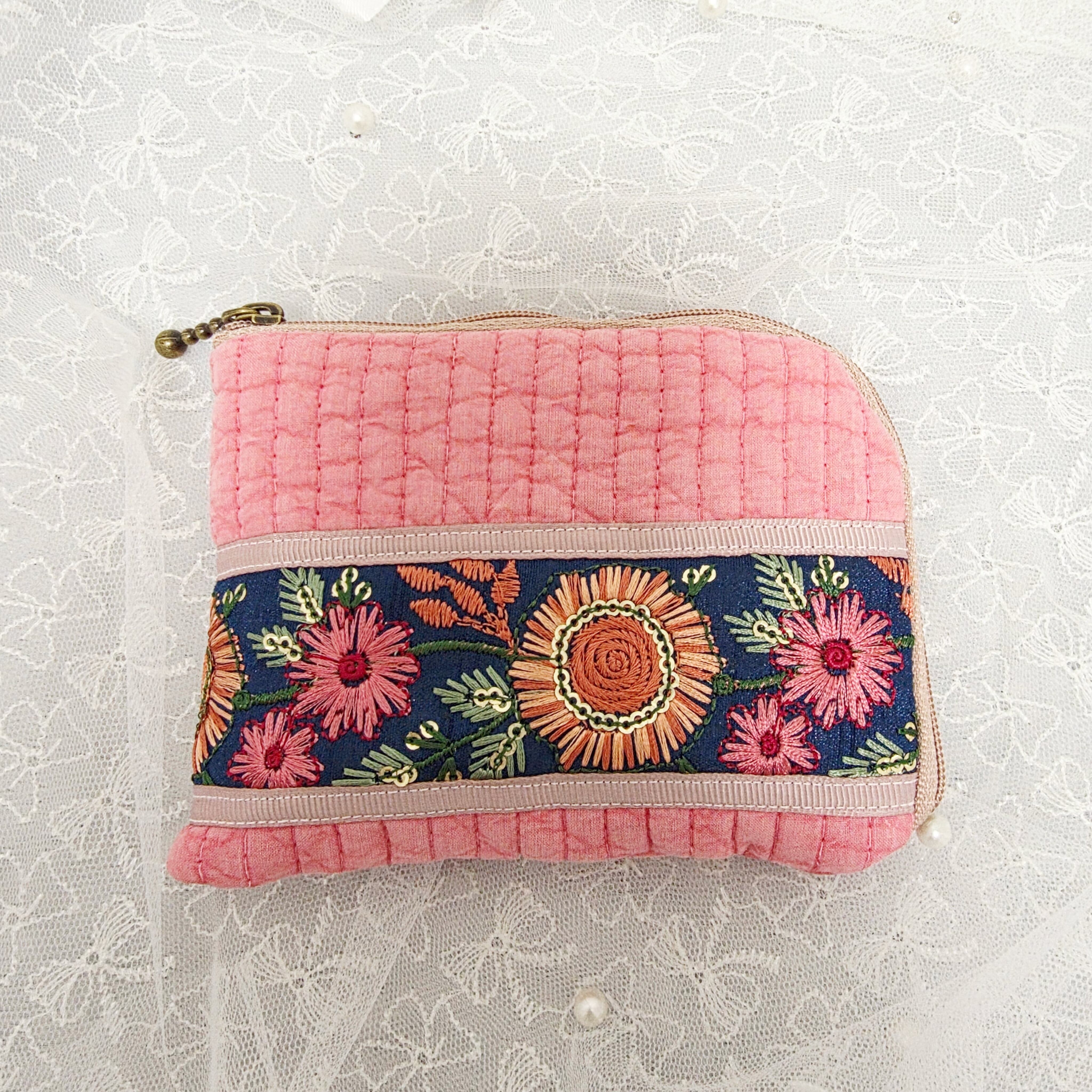L字ファスナー財布 ベビーピンクヌビ&インド刺繍リボン(紺色リボン ピンクフラワー)