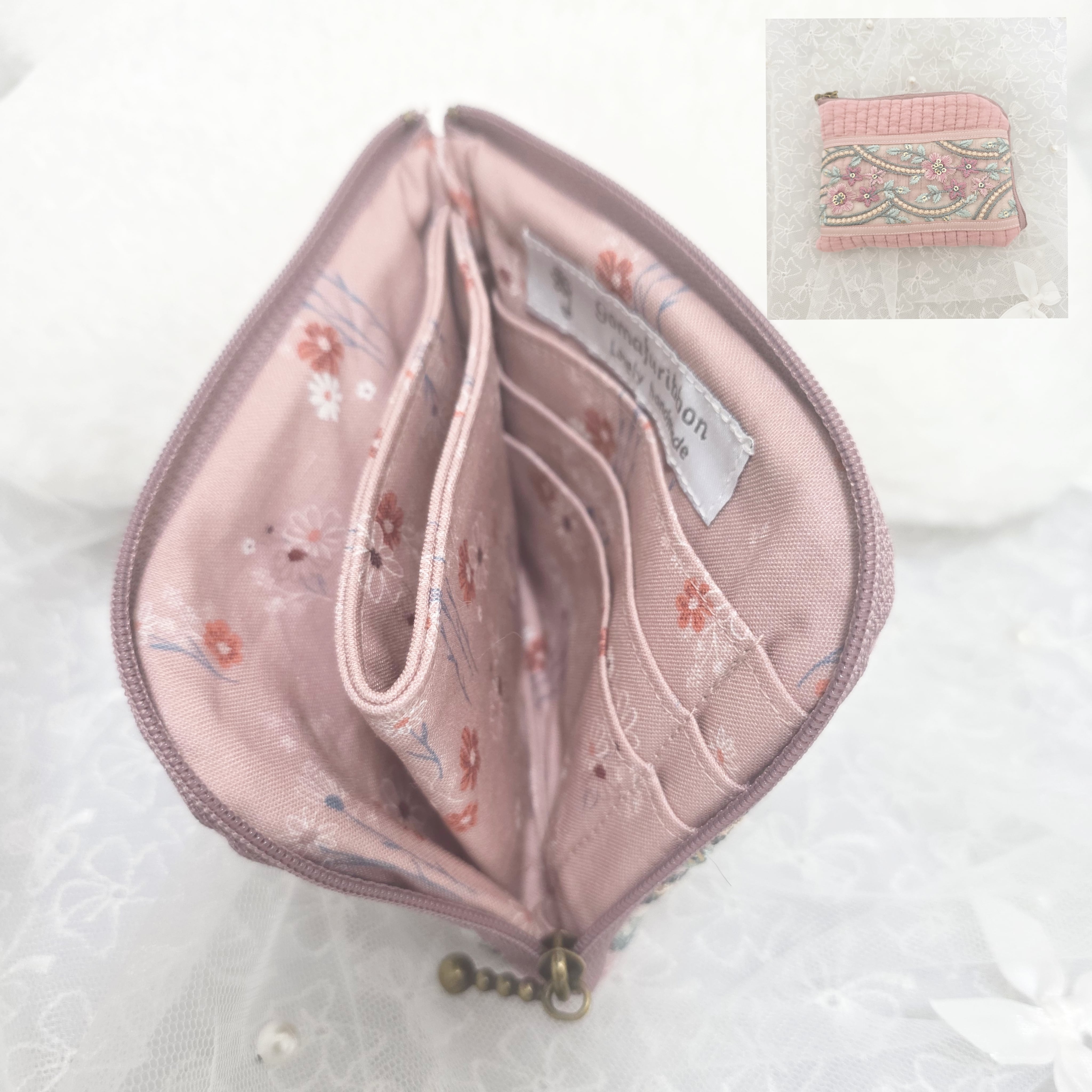 L字ファスナー財布 くすみピンクヌビ&インド刺繍リボン(メッシュリボン ピンク&ライラックフラワー)