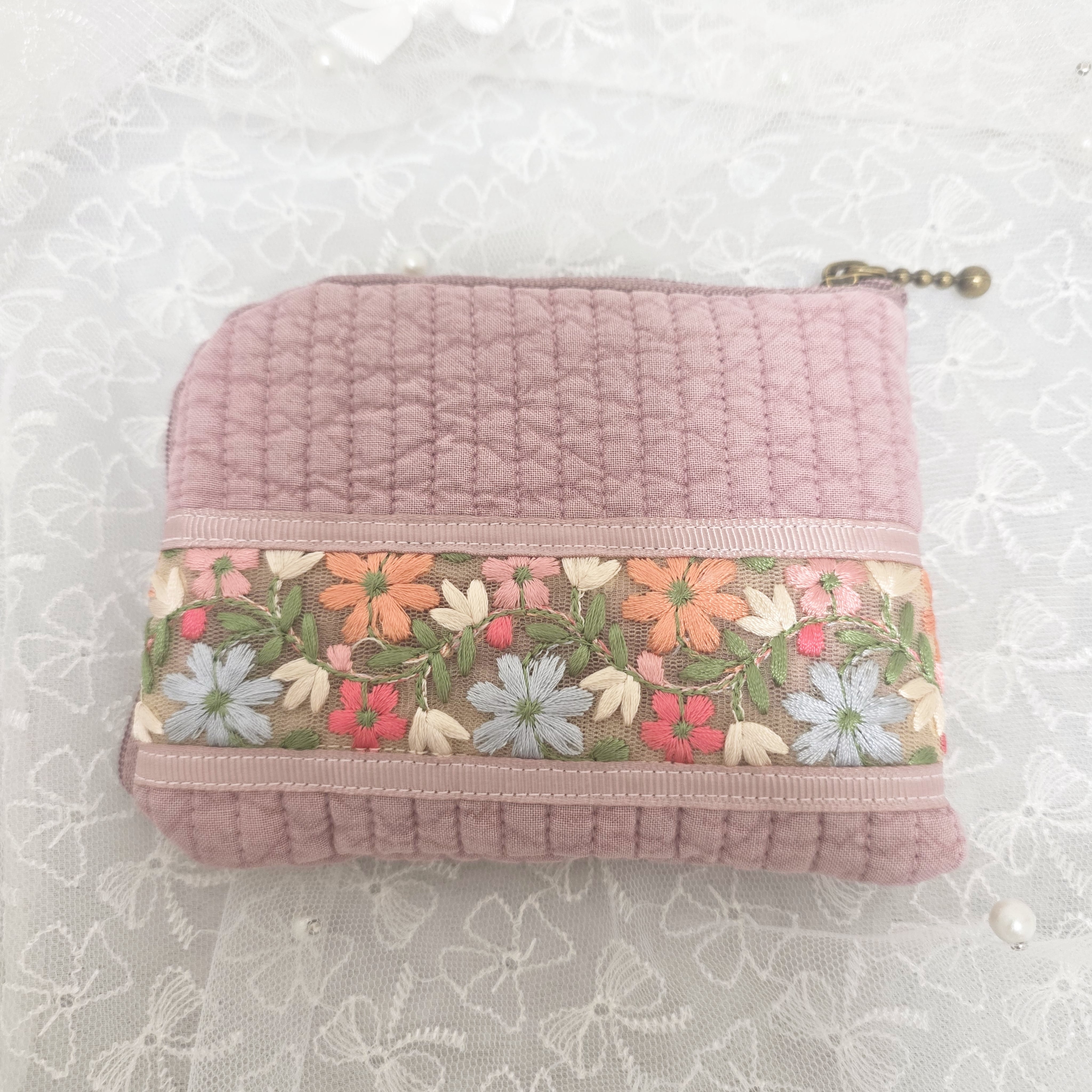 L字ファスナー財布 くすみピンクヌビ&インド刺繍リボン(メッシュリボン 小花)