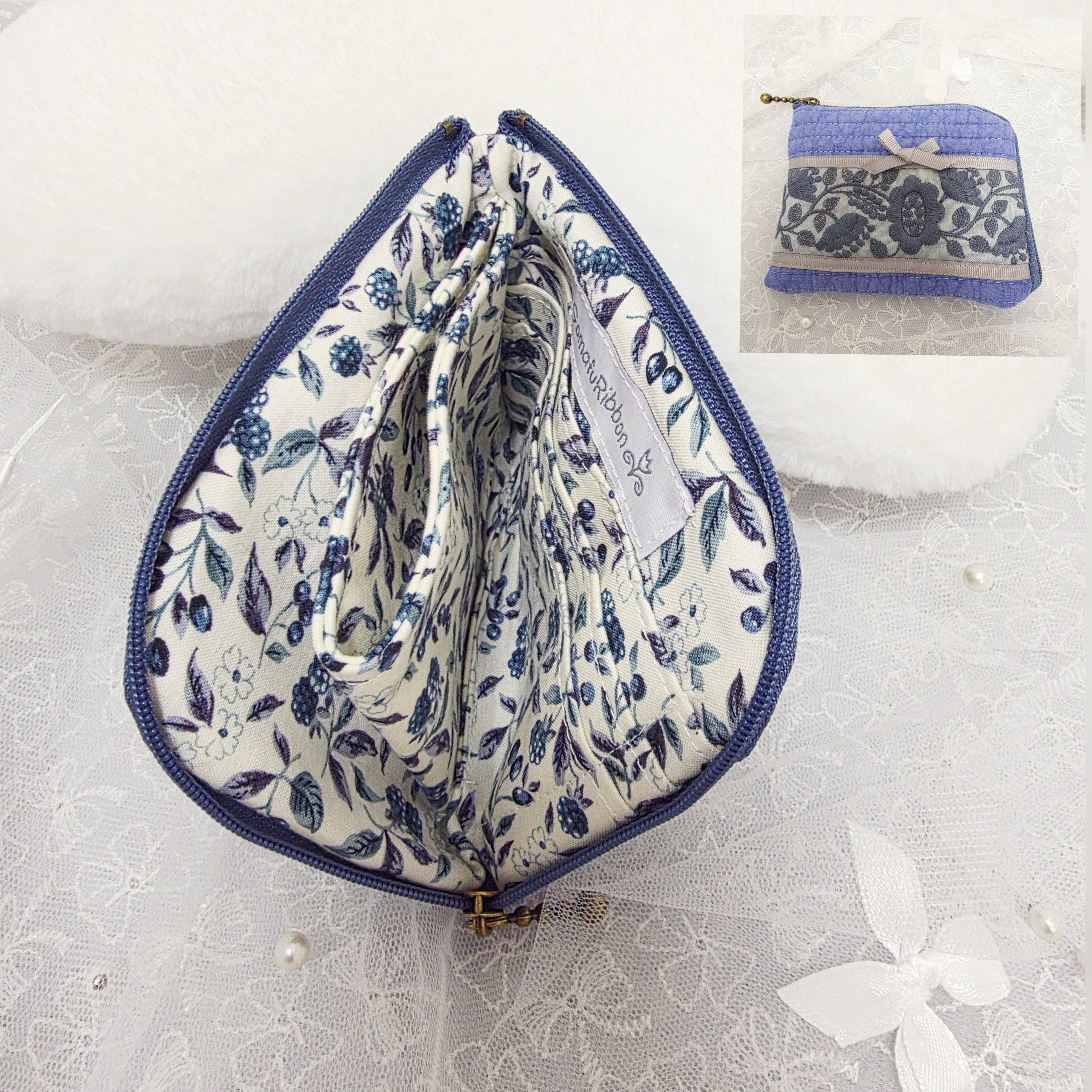 L字ファスナー財布 ブルーヌビ&インド刺繍リボン(サテンリボン くすみブルーフラワー)