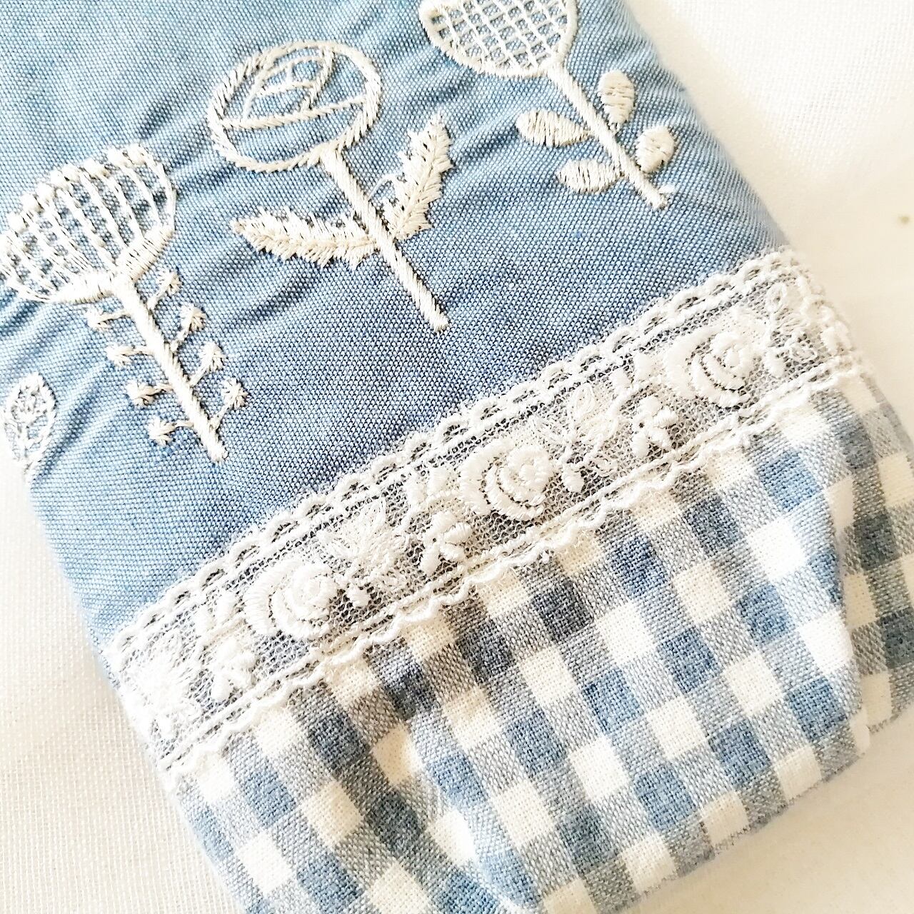 メガネケース バネ口 刺繍生地 水色xギンガムチェック