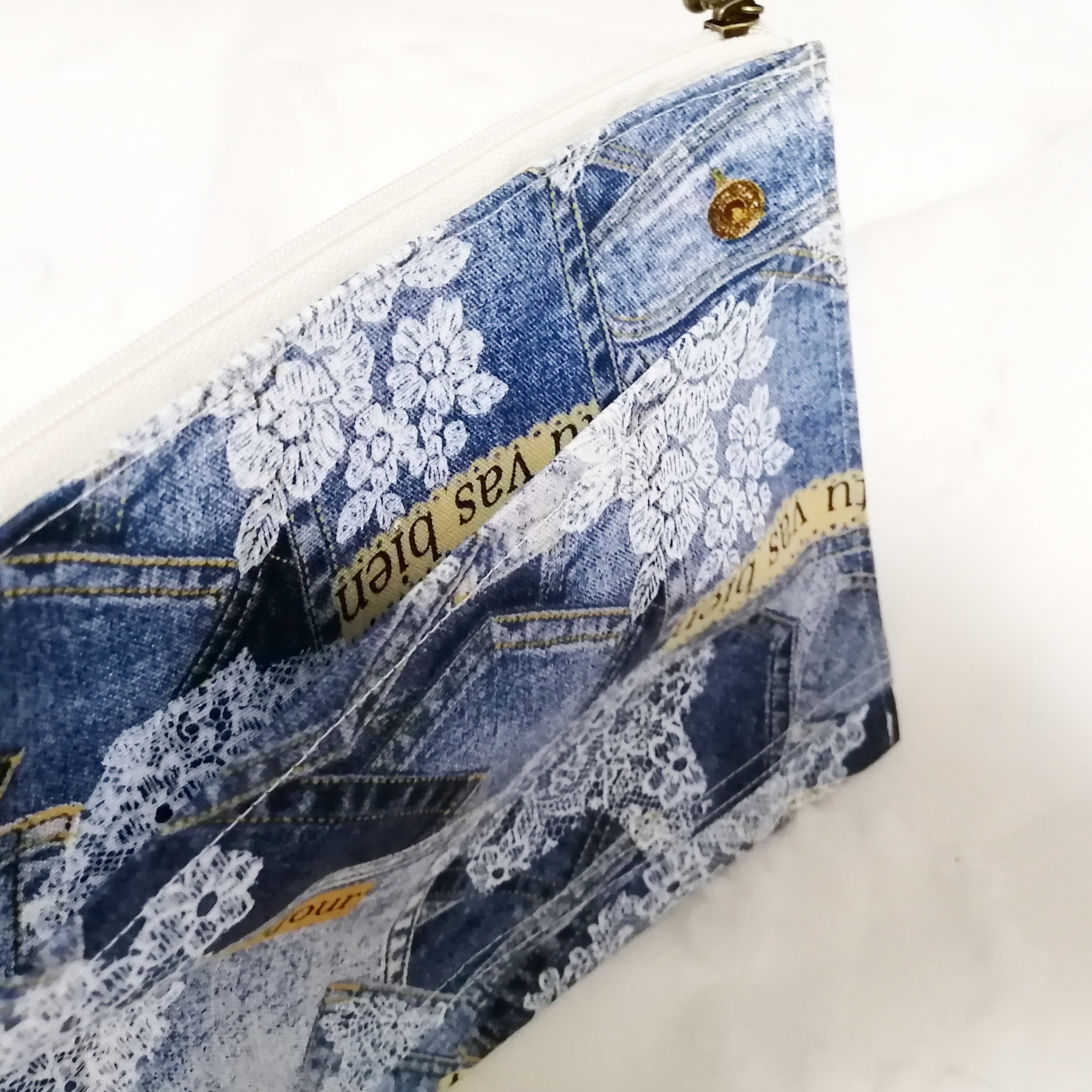 双子ポーチ 多機能 ジーンズ柄 白いレースとフリル