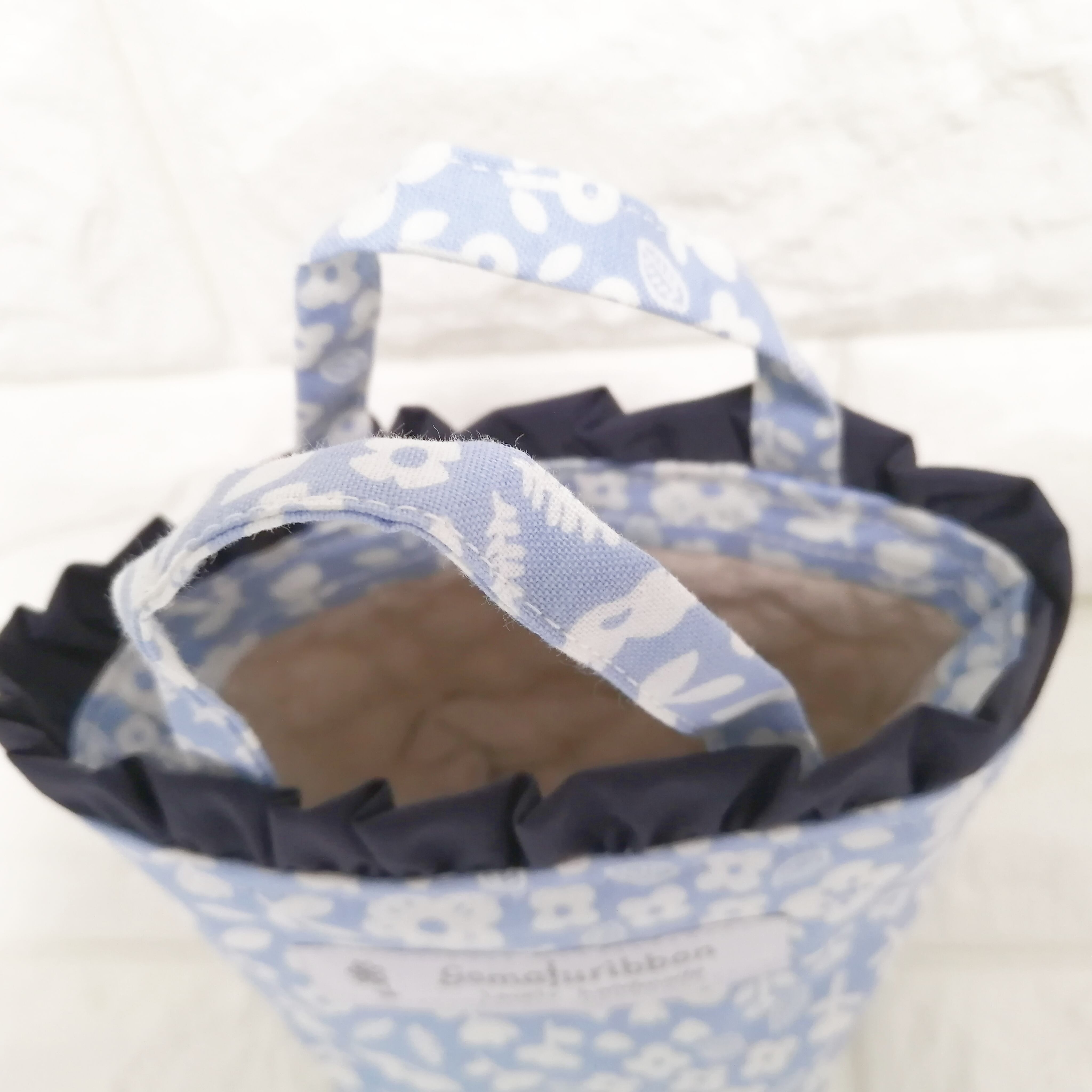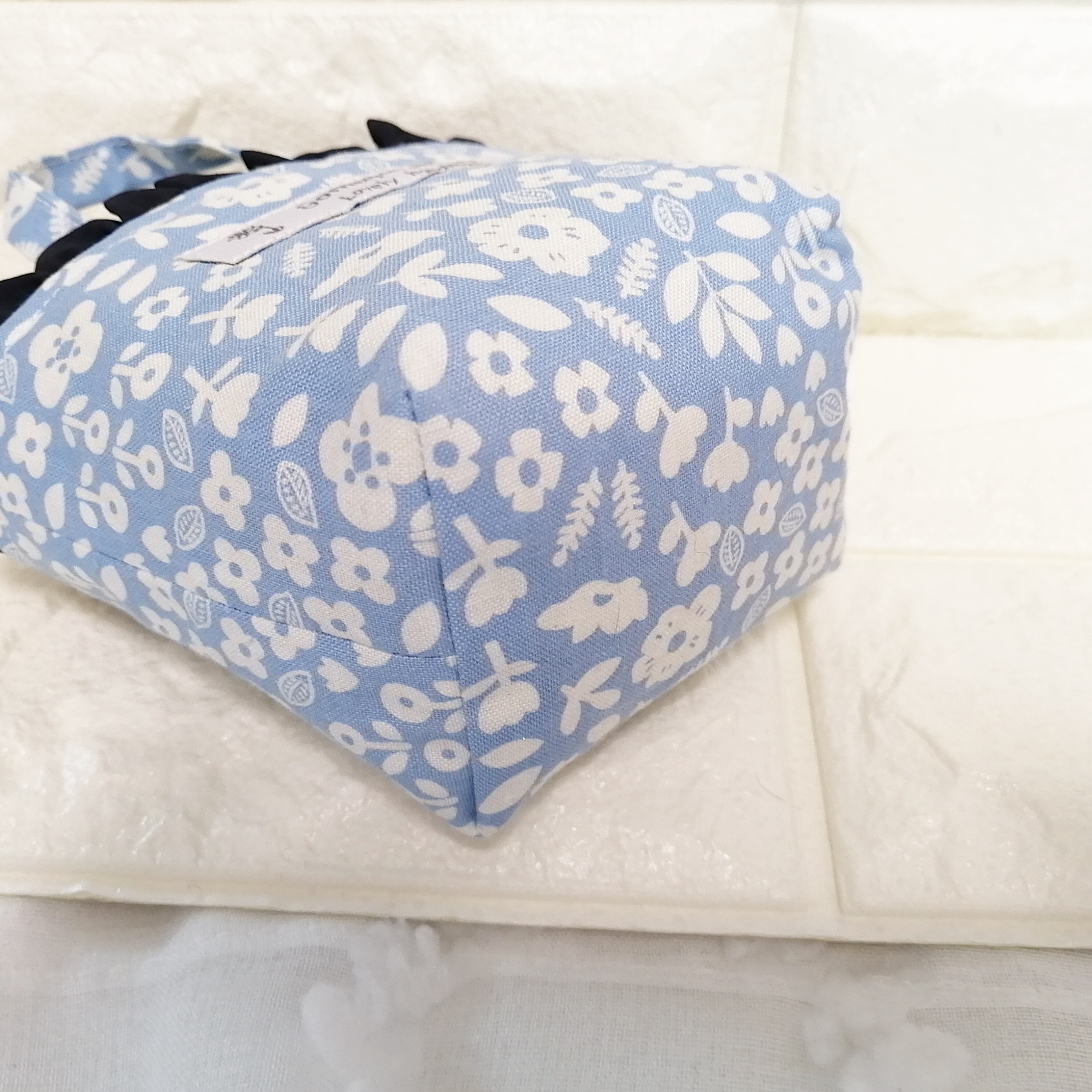 トートバッグ型の小物入れ 水色x白い小花 紺のフリル