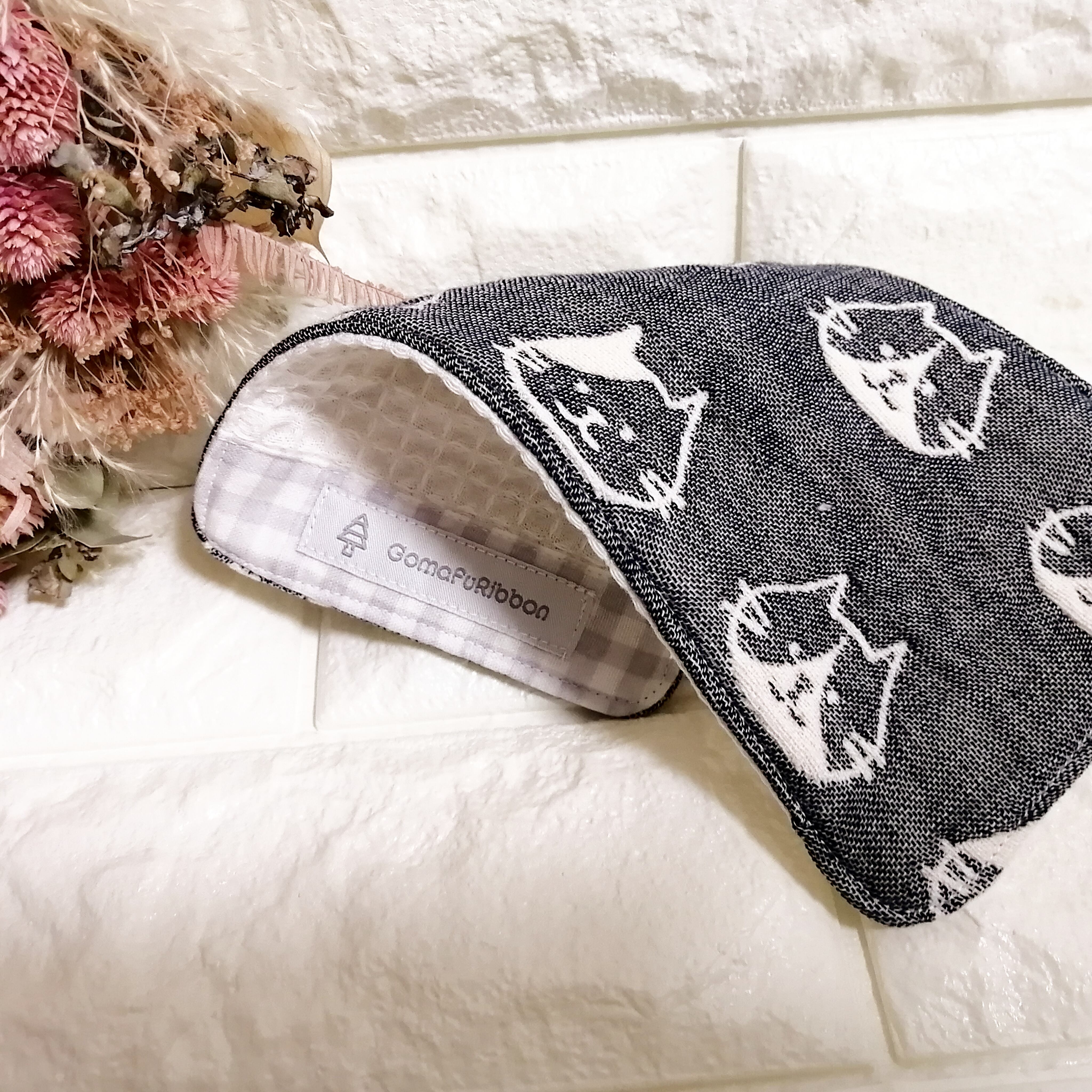 ガーゼのハンカチ 長方形 2層(6重ガーゼ x ワッフル生地)ニャンコ ブラック