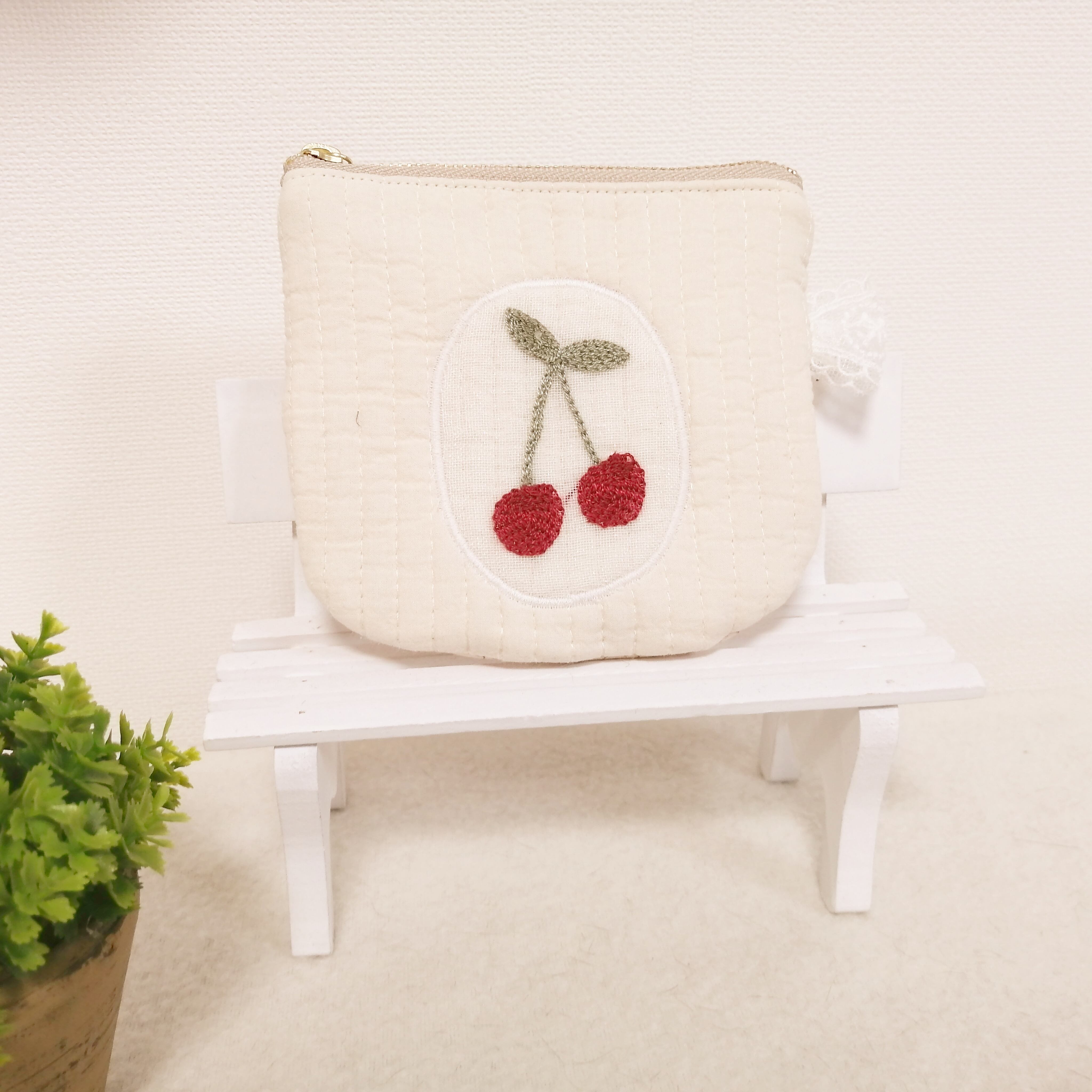 さくらんぼアップリケのふわふわポーチ ミルク ヌビキルティング