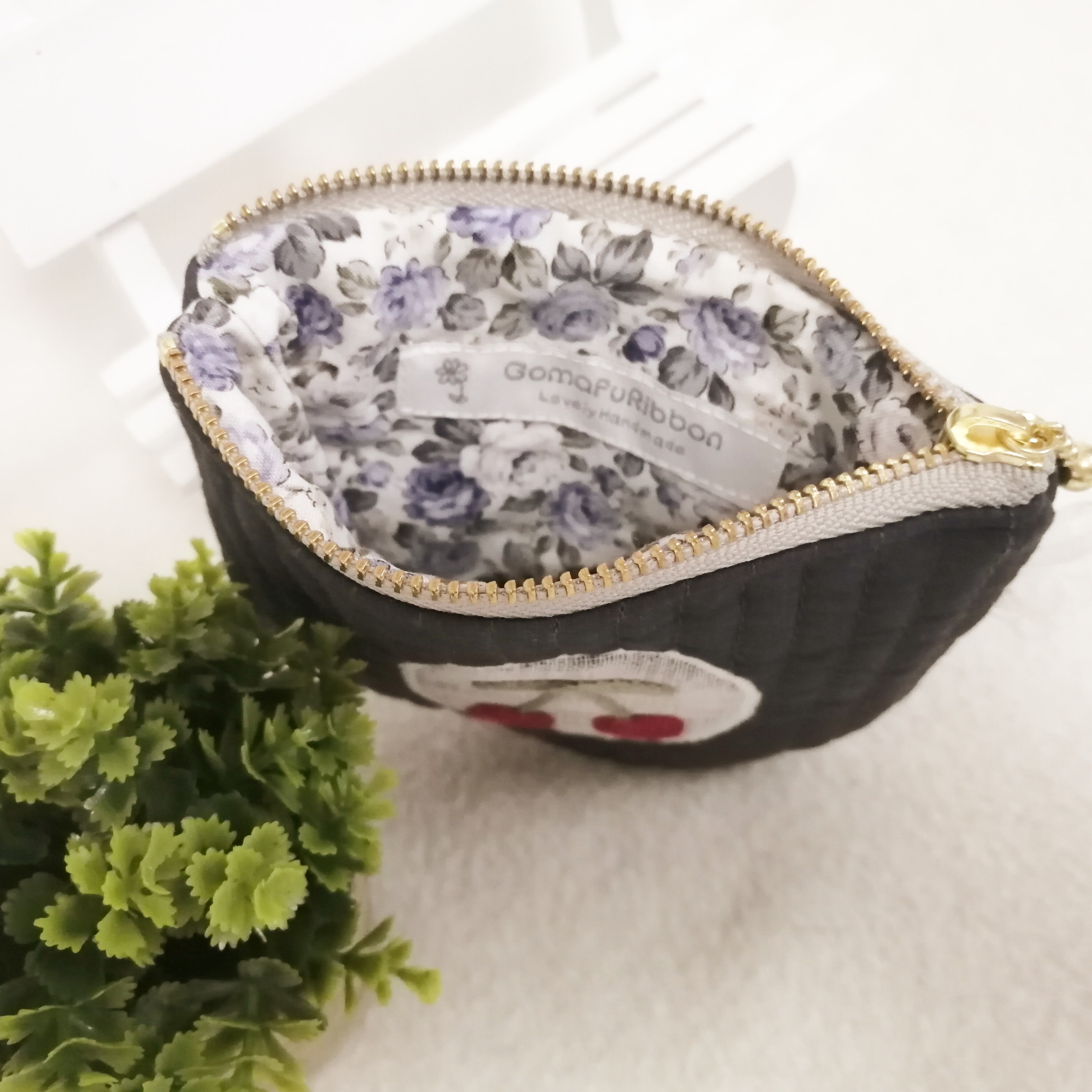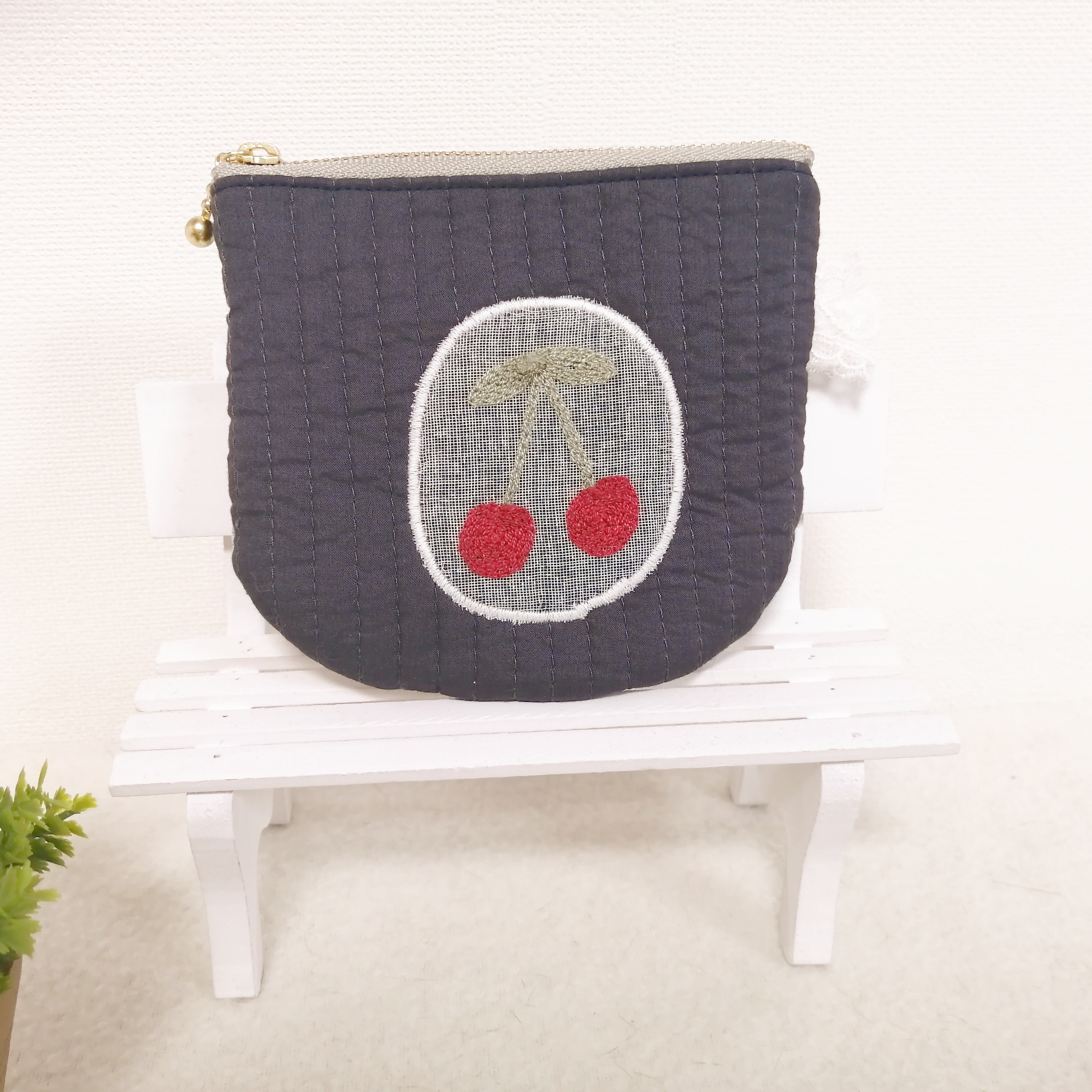 肌触りがふわふわのヌビキルティングにさくらんぼのアップリケをあしらったポーチです。