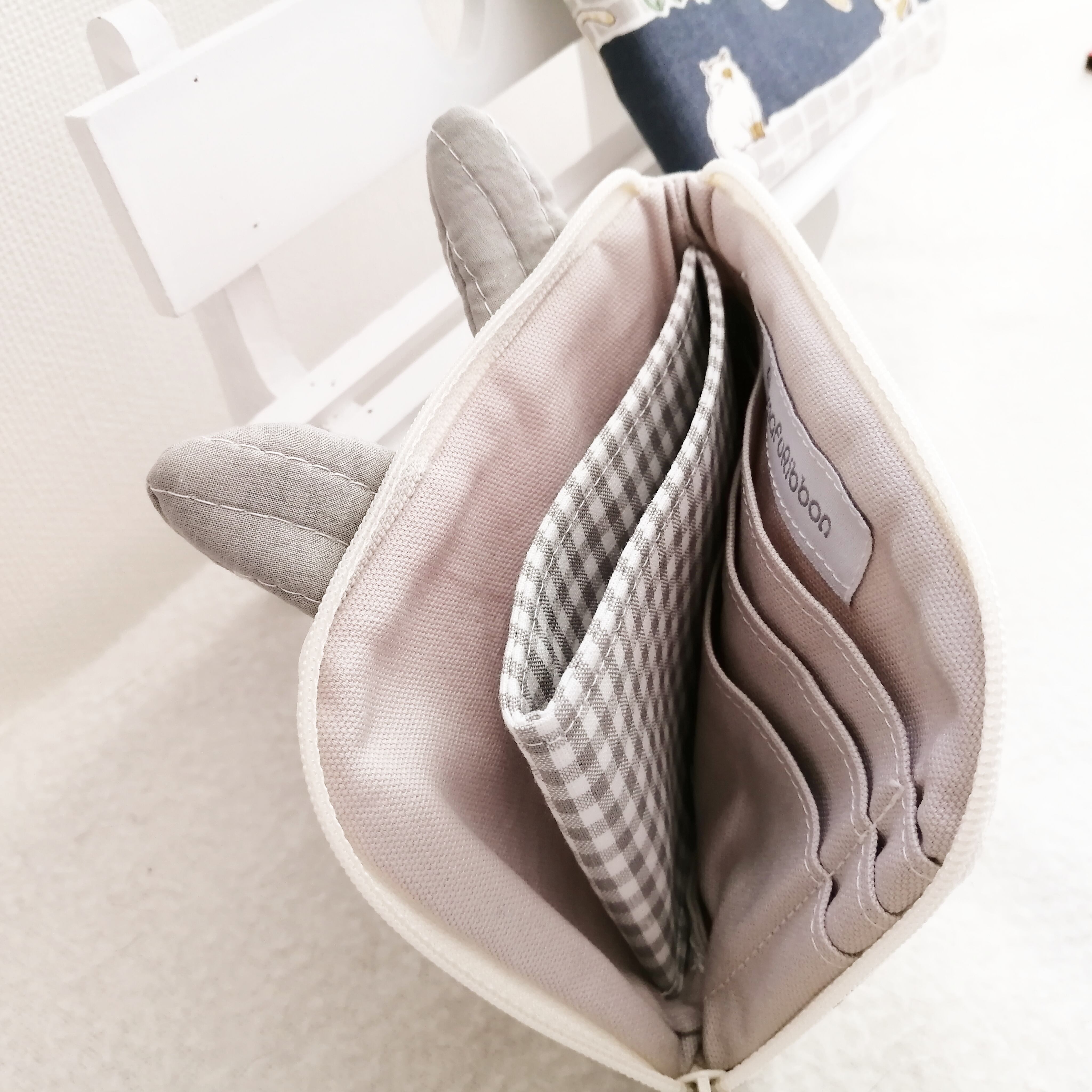 お腹のなかには、逆さまにしても小銭が飛び出ない小銭ポケットとカードポケットが付いてます。