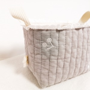 ふわふわ布バスケット イブルキルト グレー さくらんぼ刺繍 ホワイトレースのふちどり
