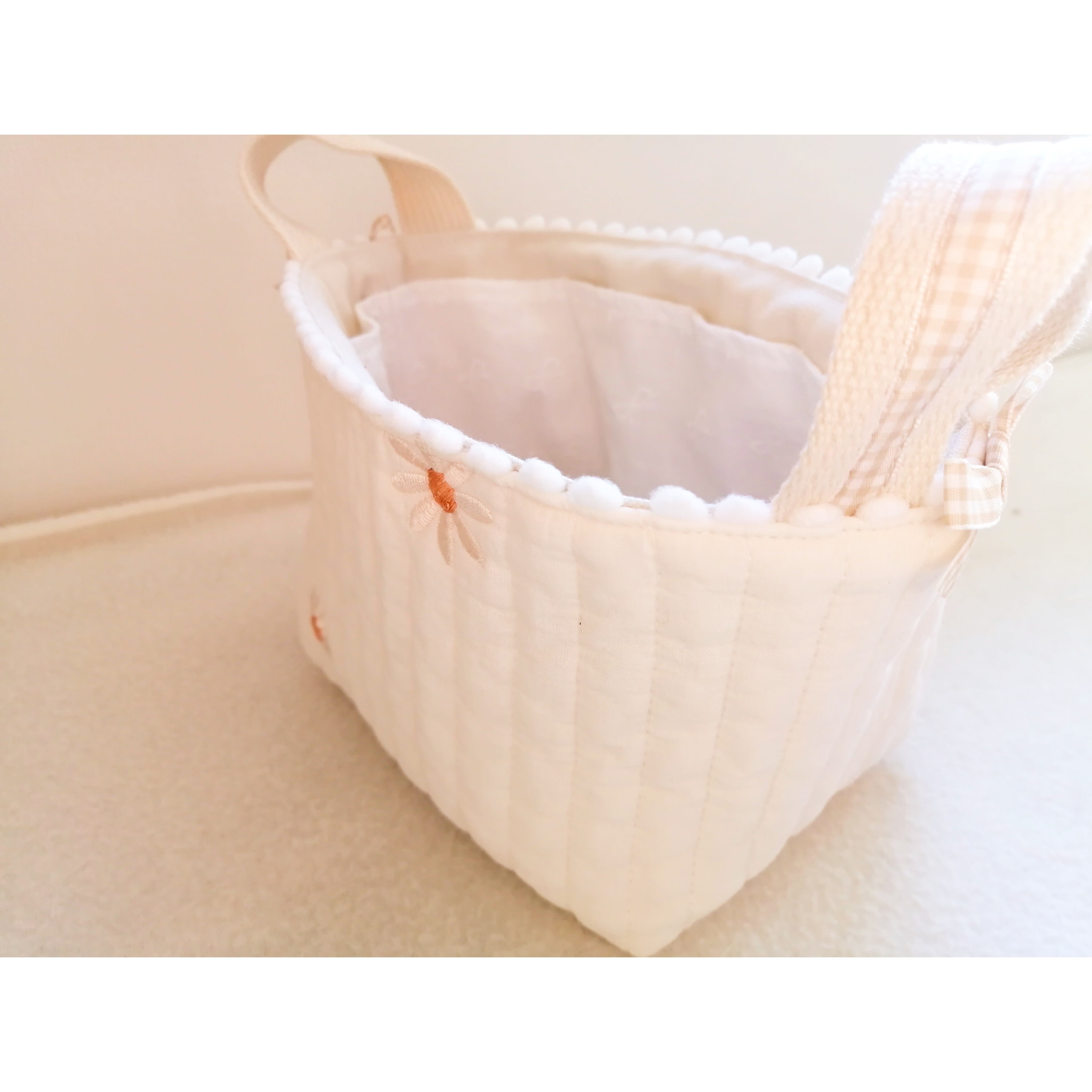 ぽんぽんギンガム布バスケット ヌビキルト グレーマーガレット刺繍 ポンポンふちどり ベージュギンガムリボンの持ち手
