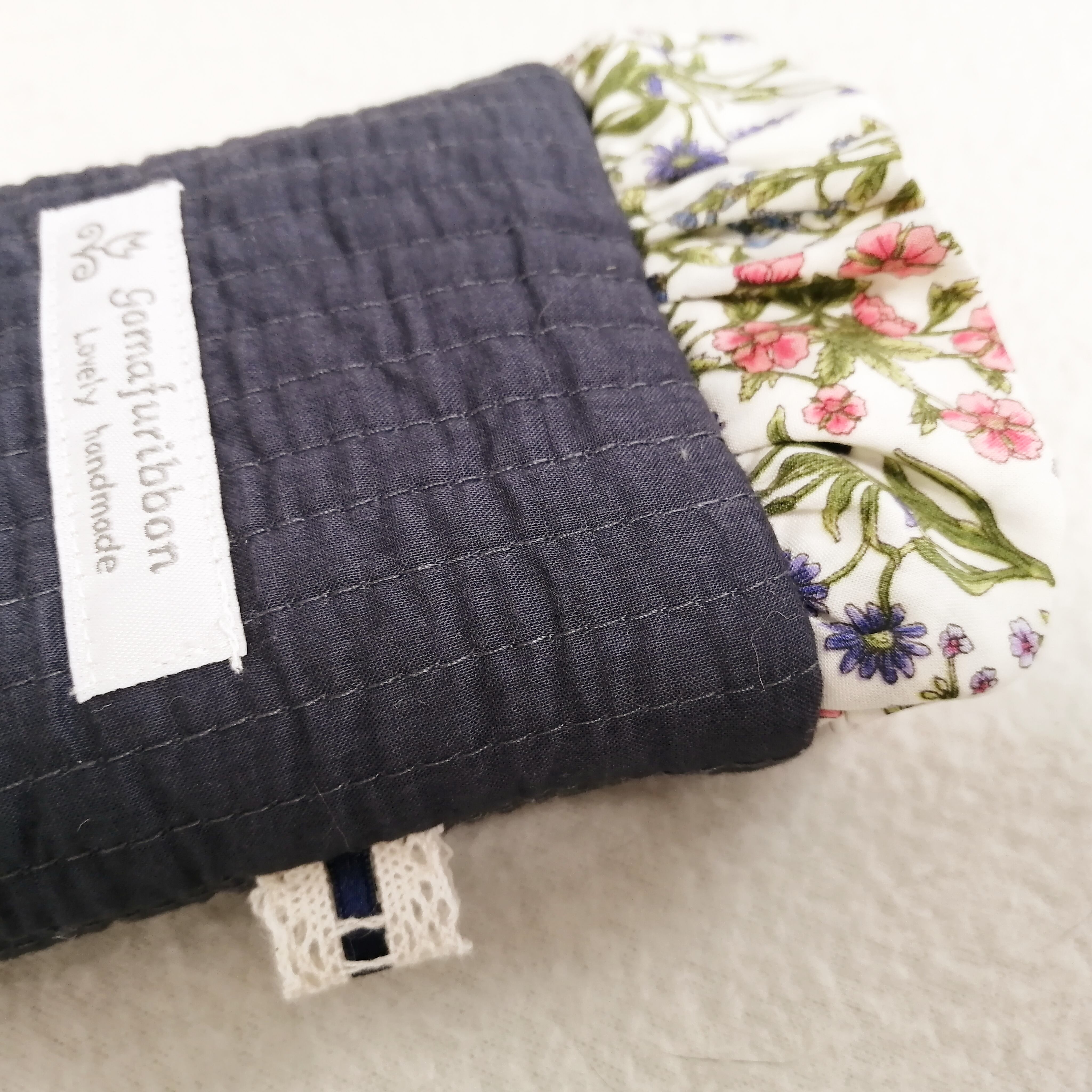 ほんわりフリルのめがねポーチ ヌビキルト バネ口 フラワーフリル 紺色