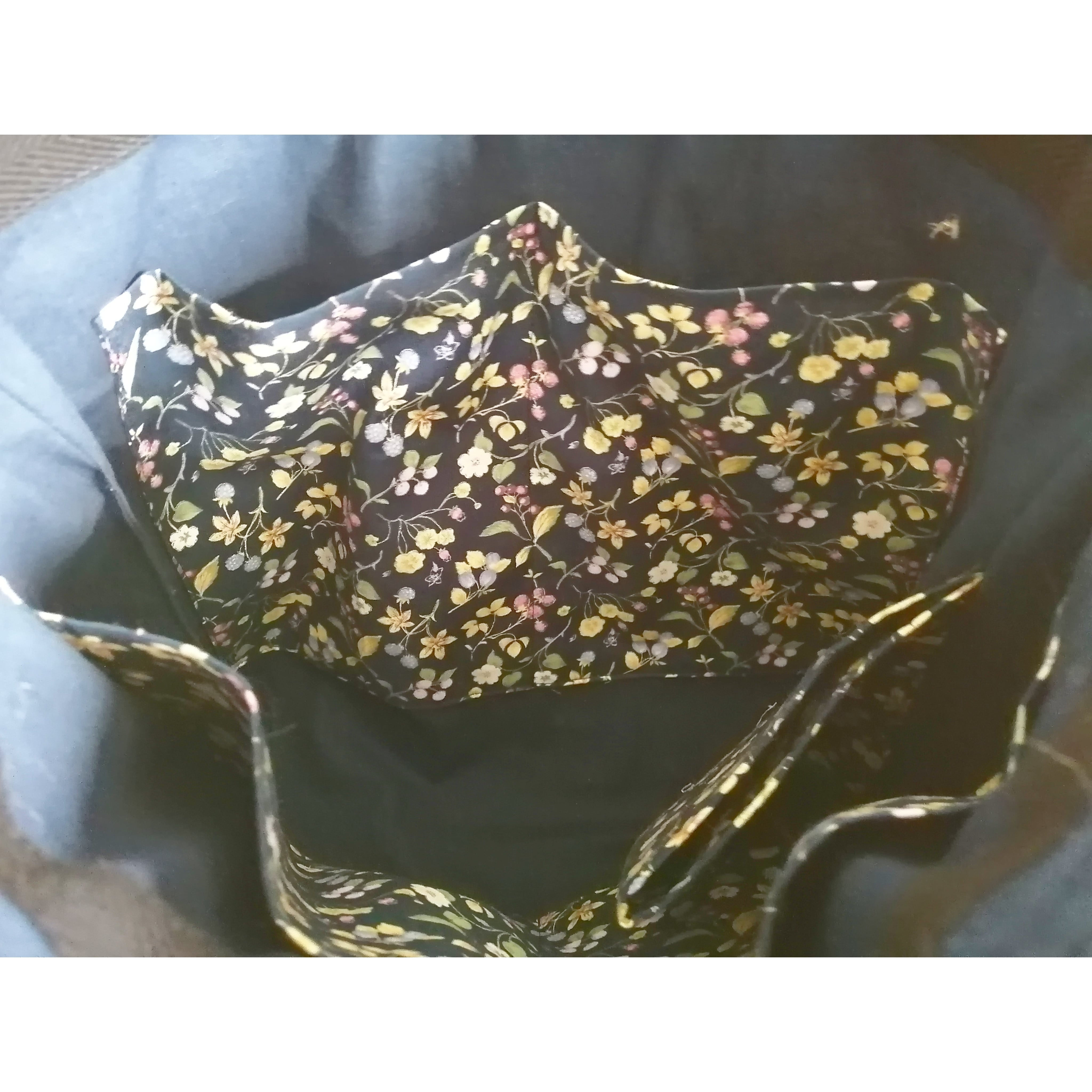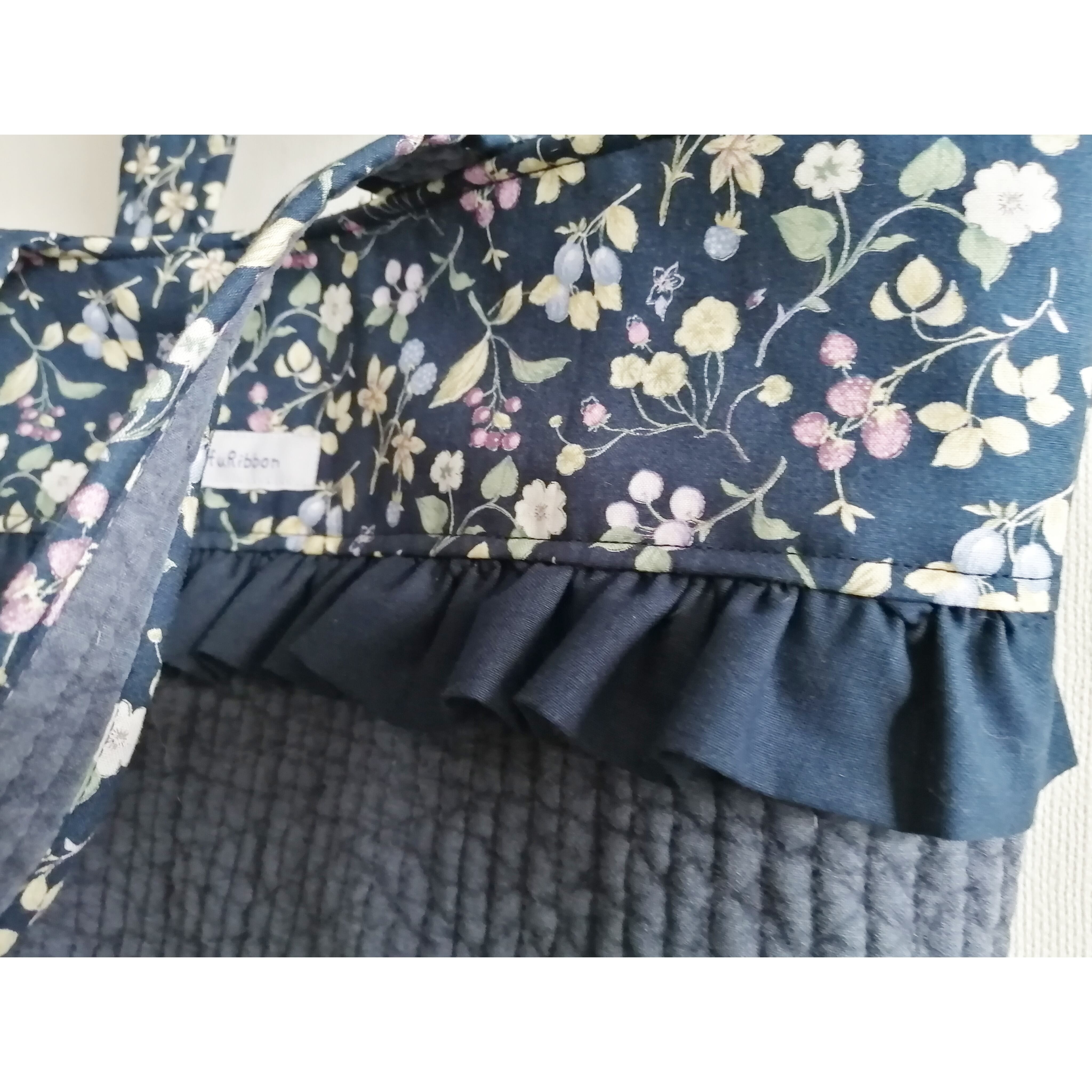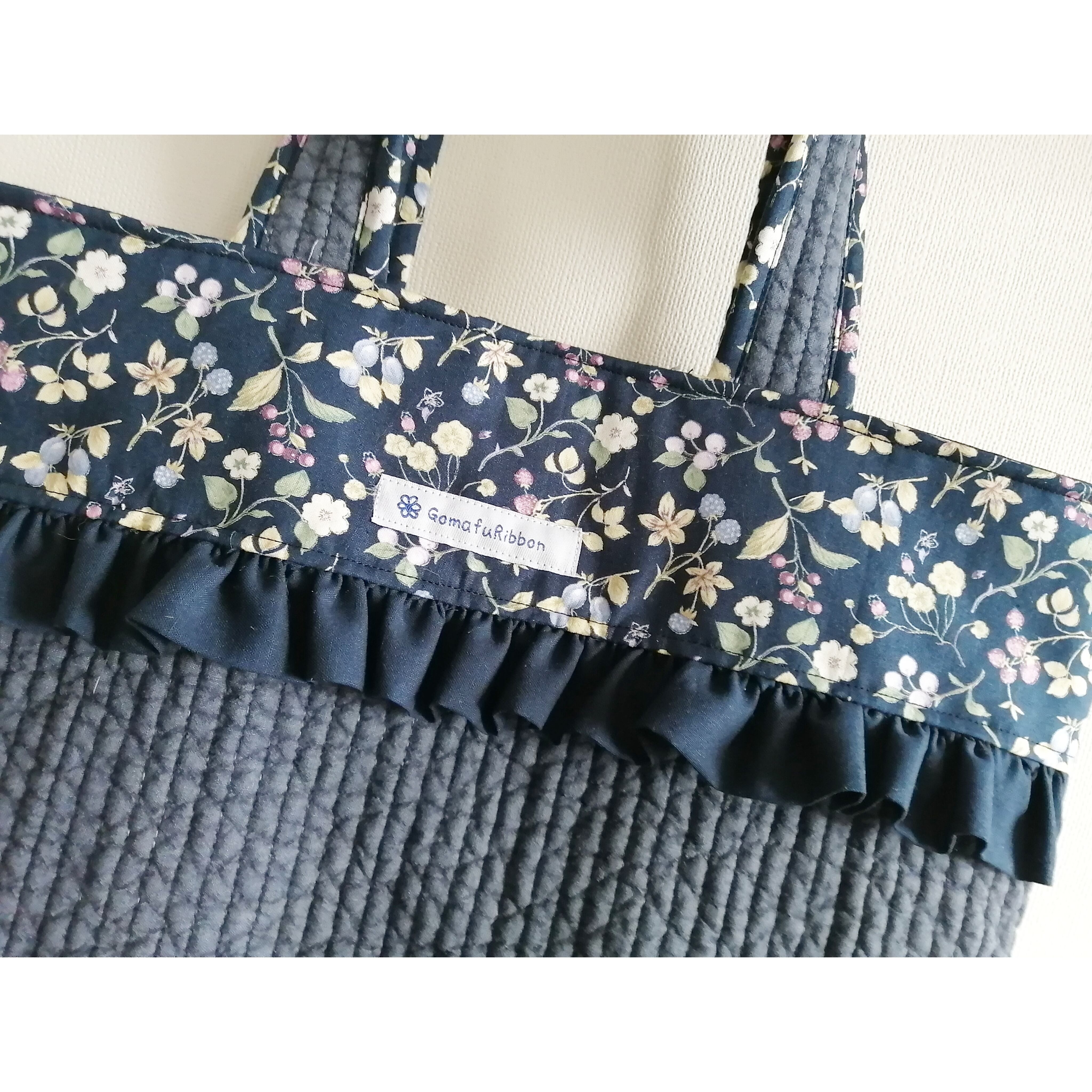 きれいめ神フリルヌビトートバッグ ネイビーヌビ ベリー&フラワー柄 A4サイズ