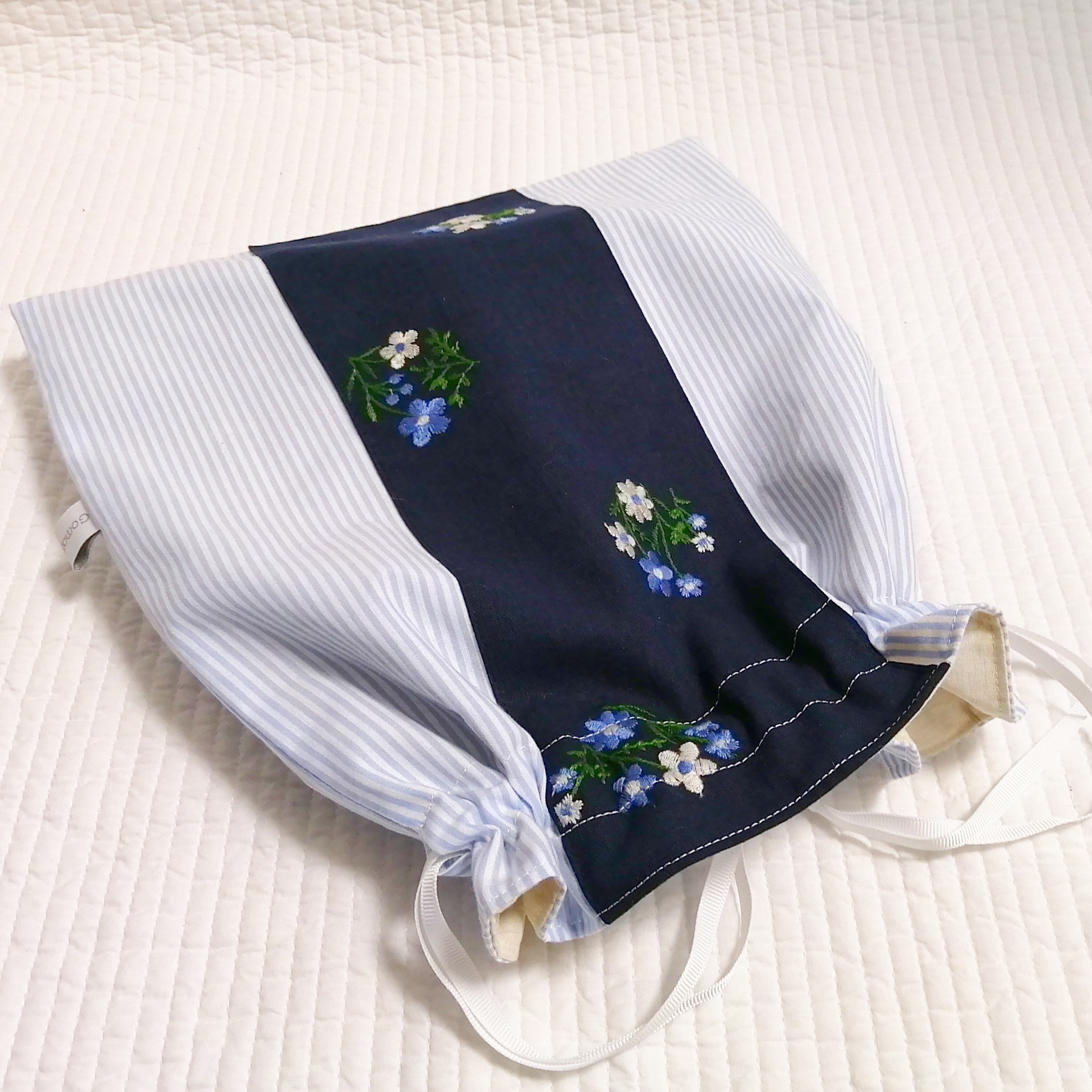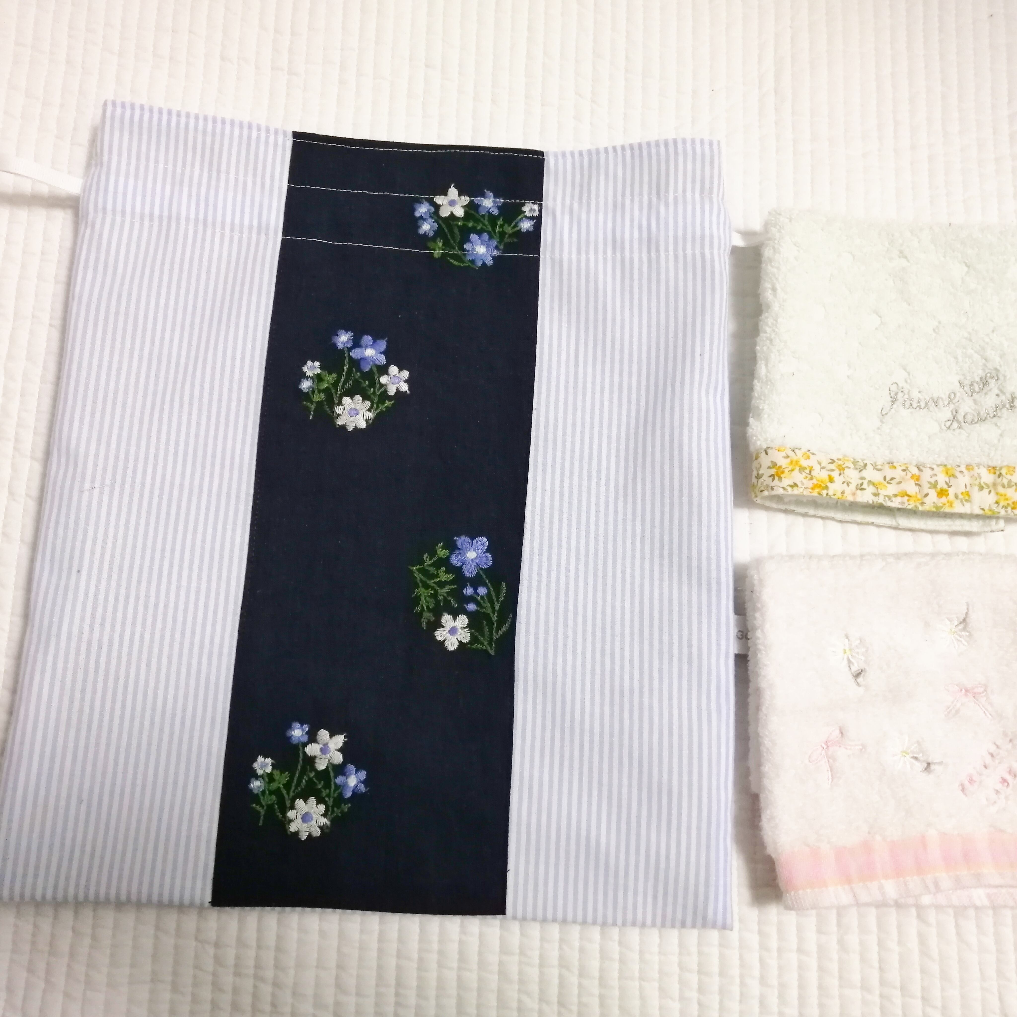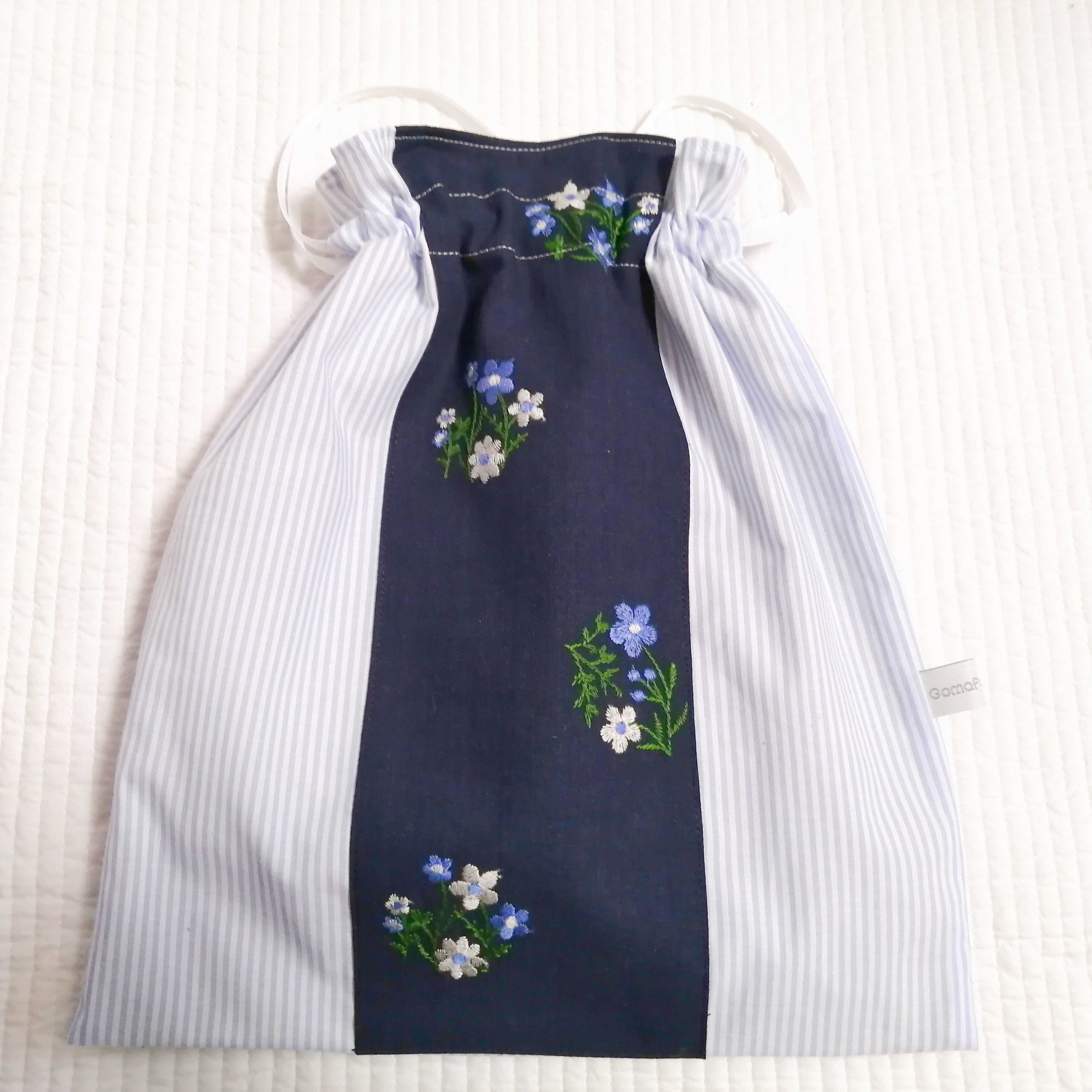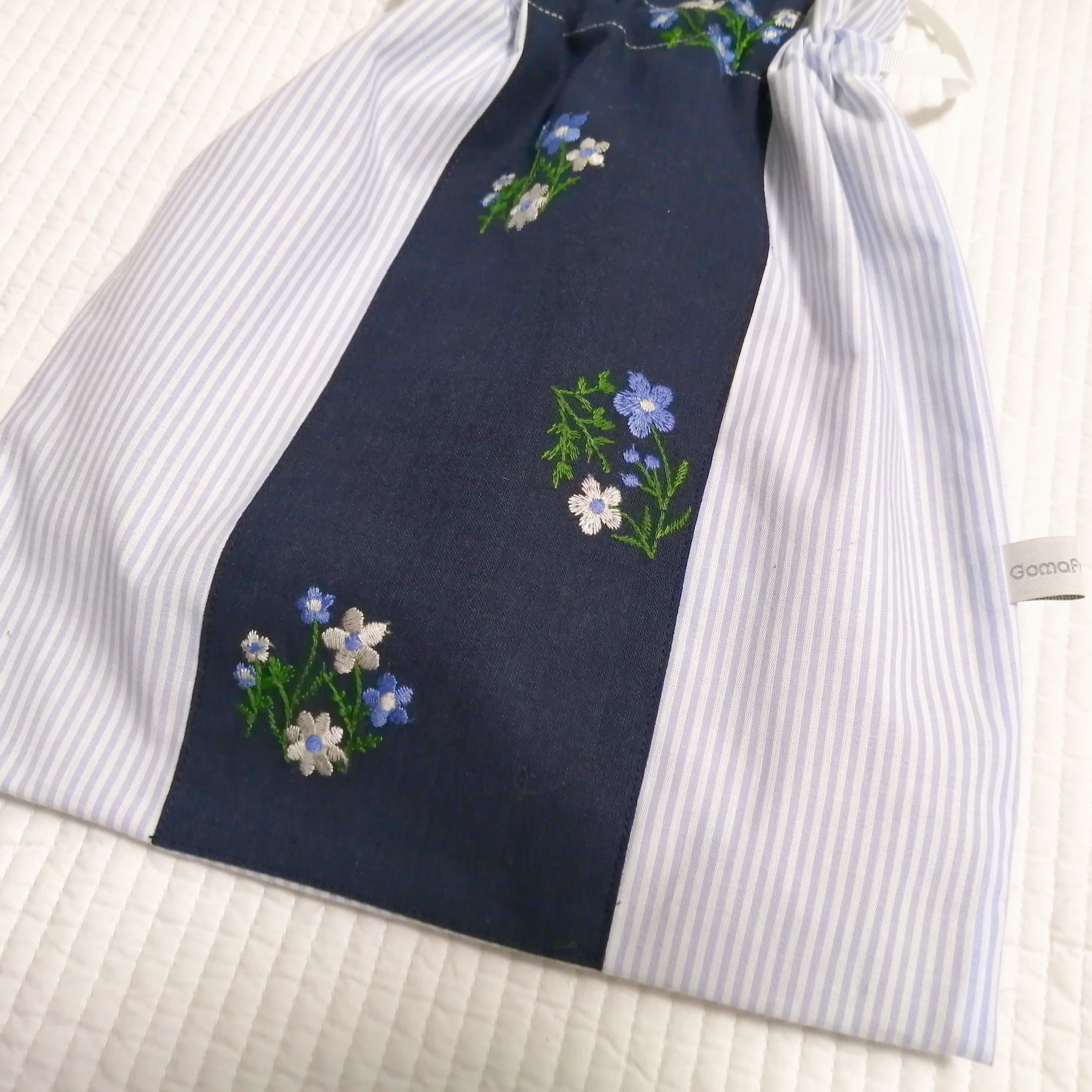 花刺繍&水色ストライプの巾着ポーチ(お着換え袋サイズ) 花刺繍ボーダー マチなし