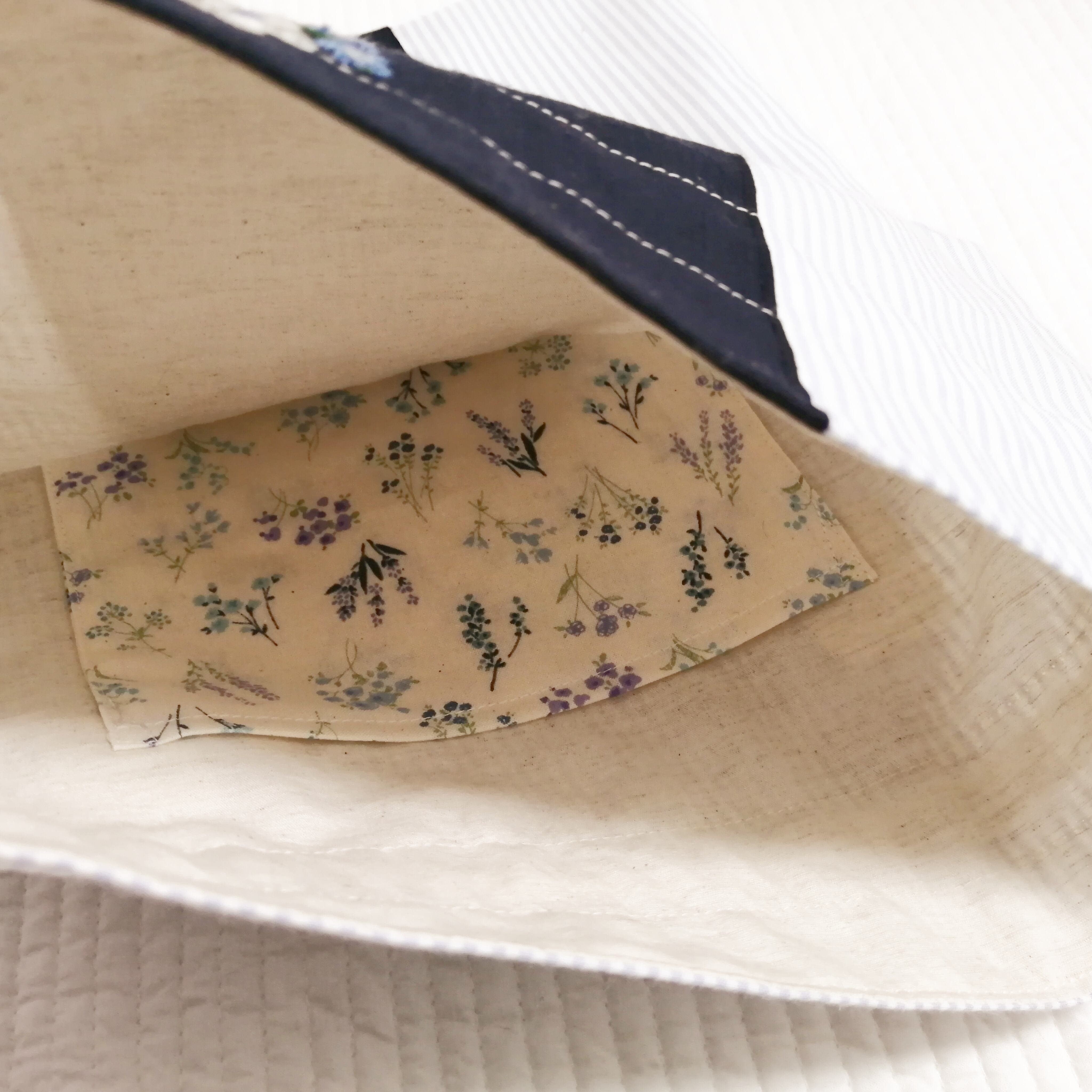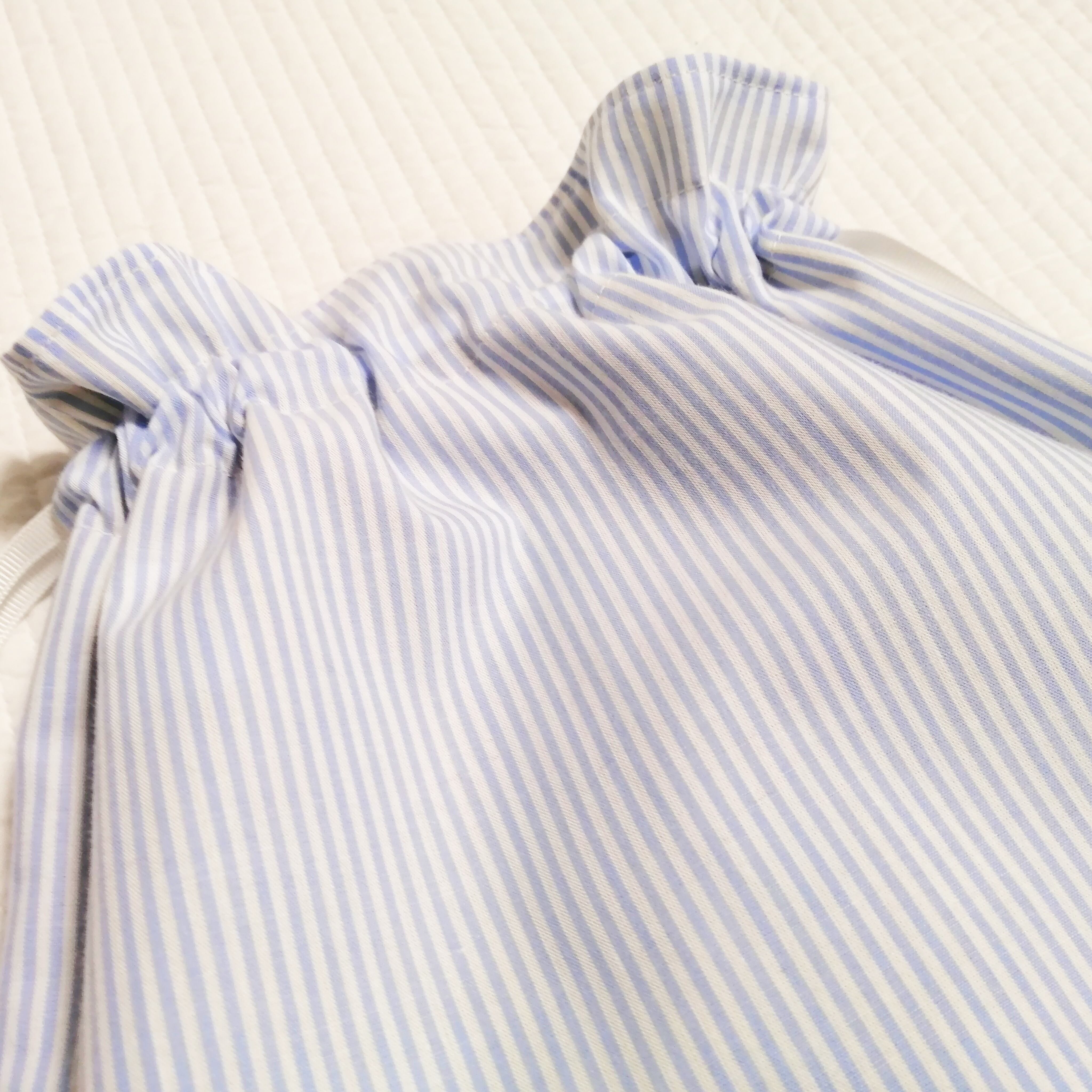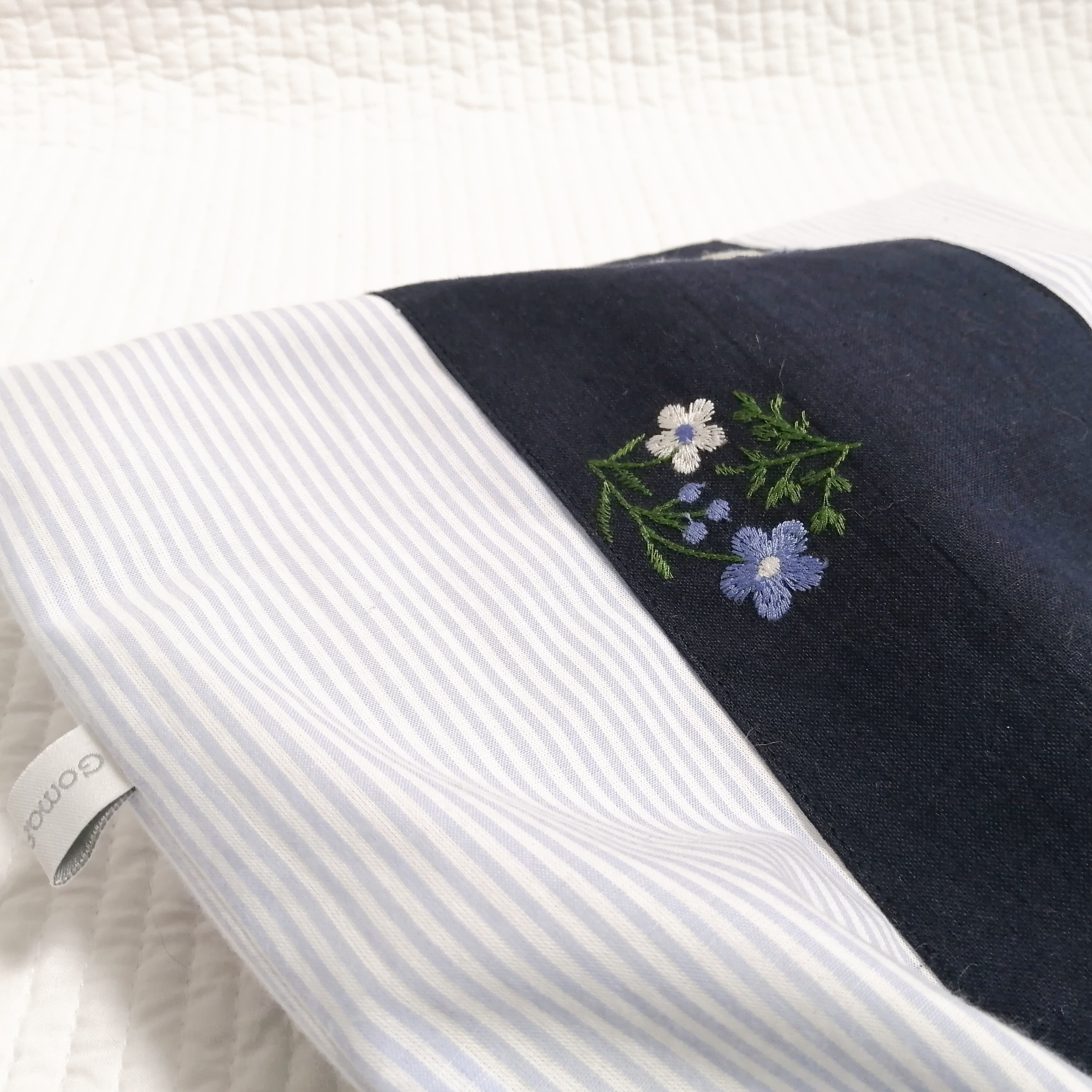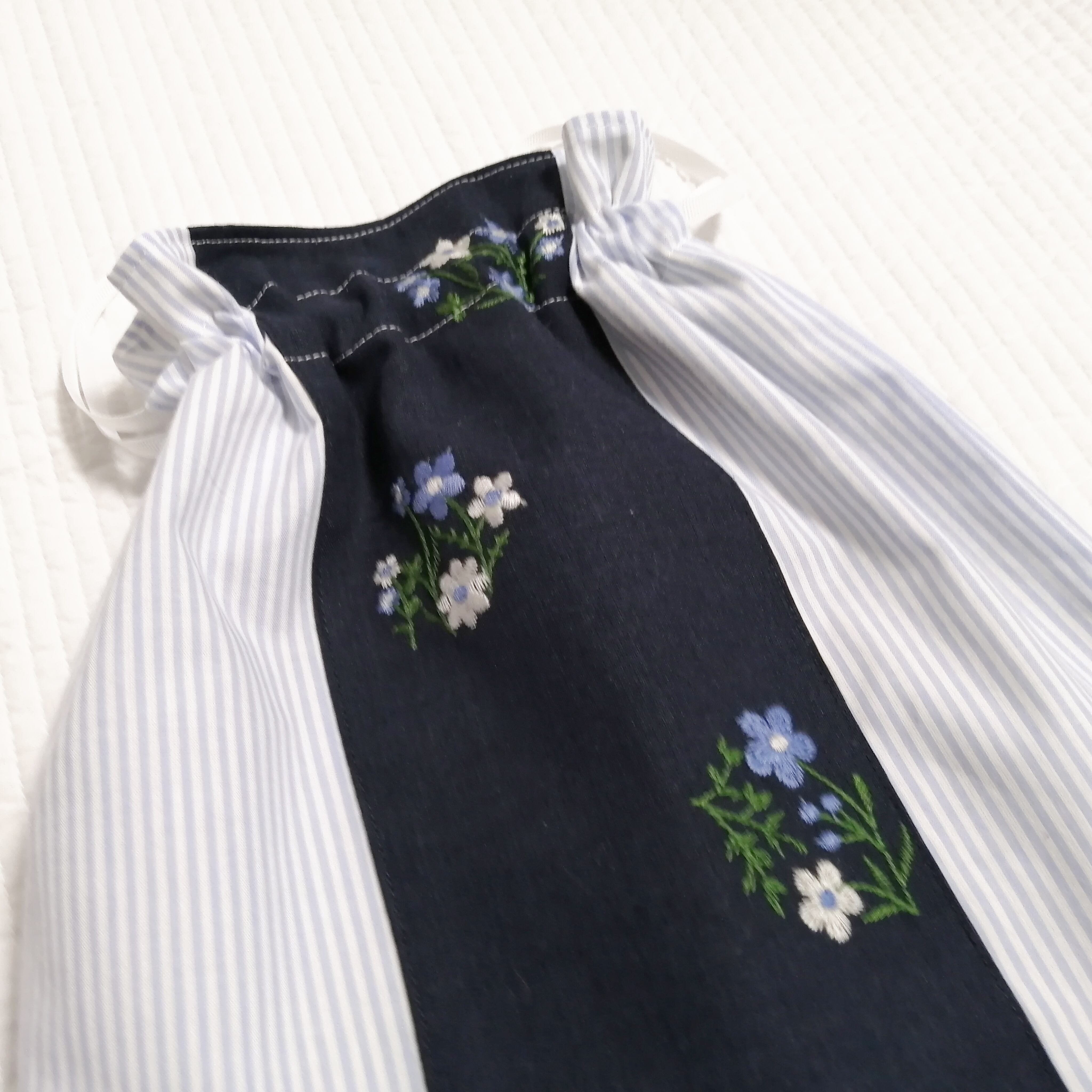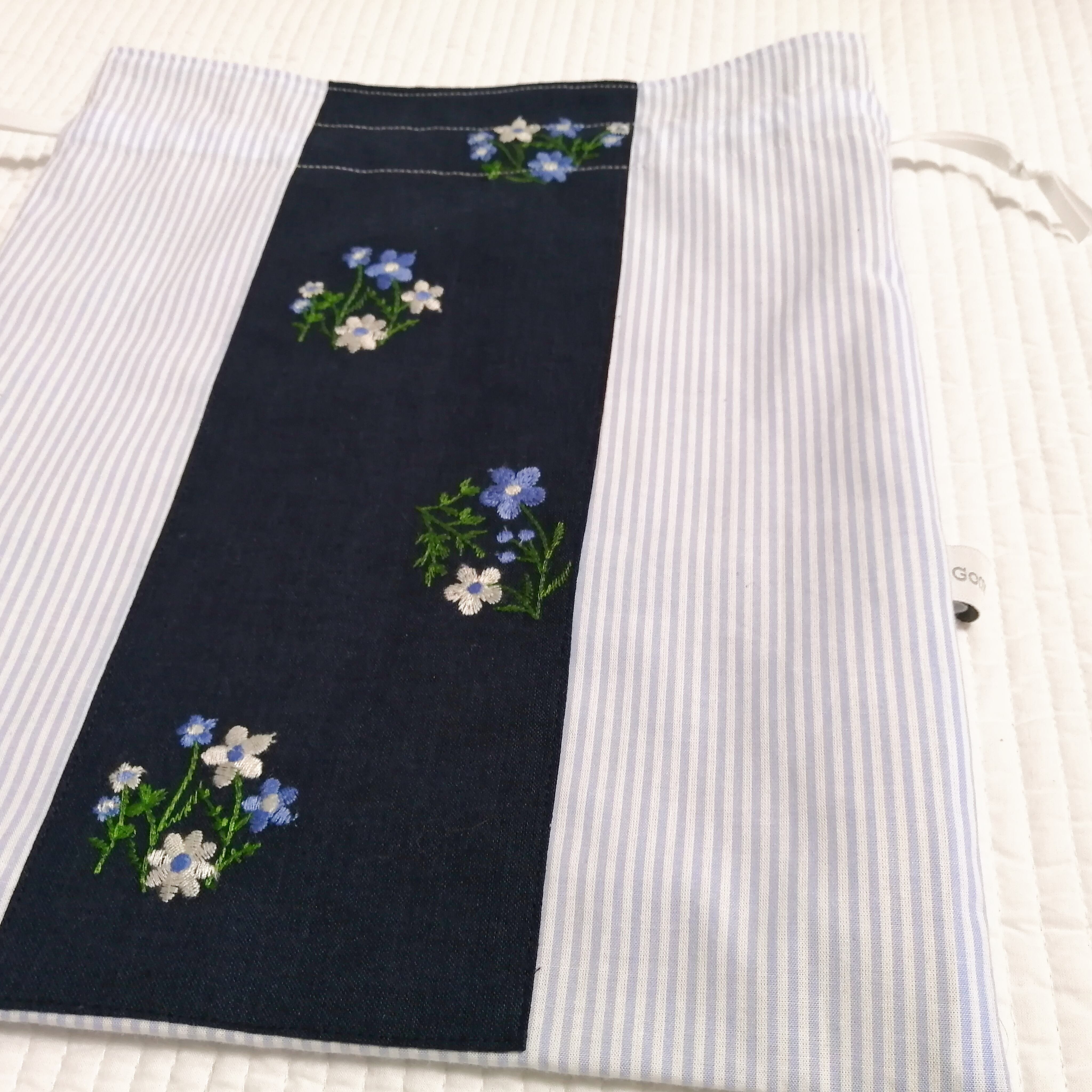 花刺繍&水色ストライプの巾着ポーチ(お着換え袋サイズ) 花刺繍ボーダー マチなし