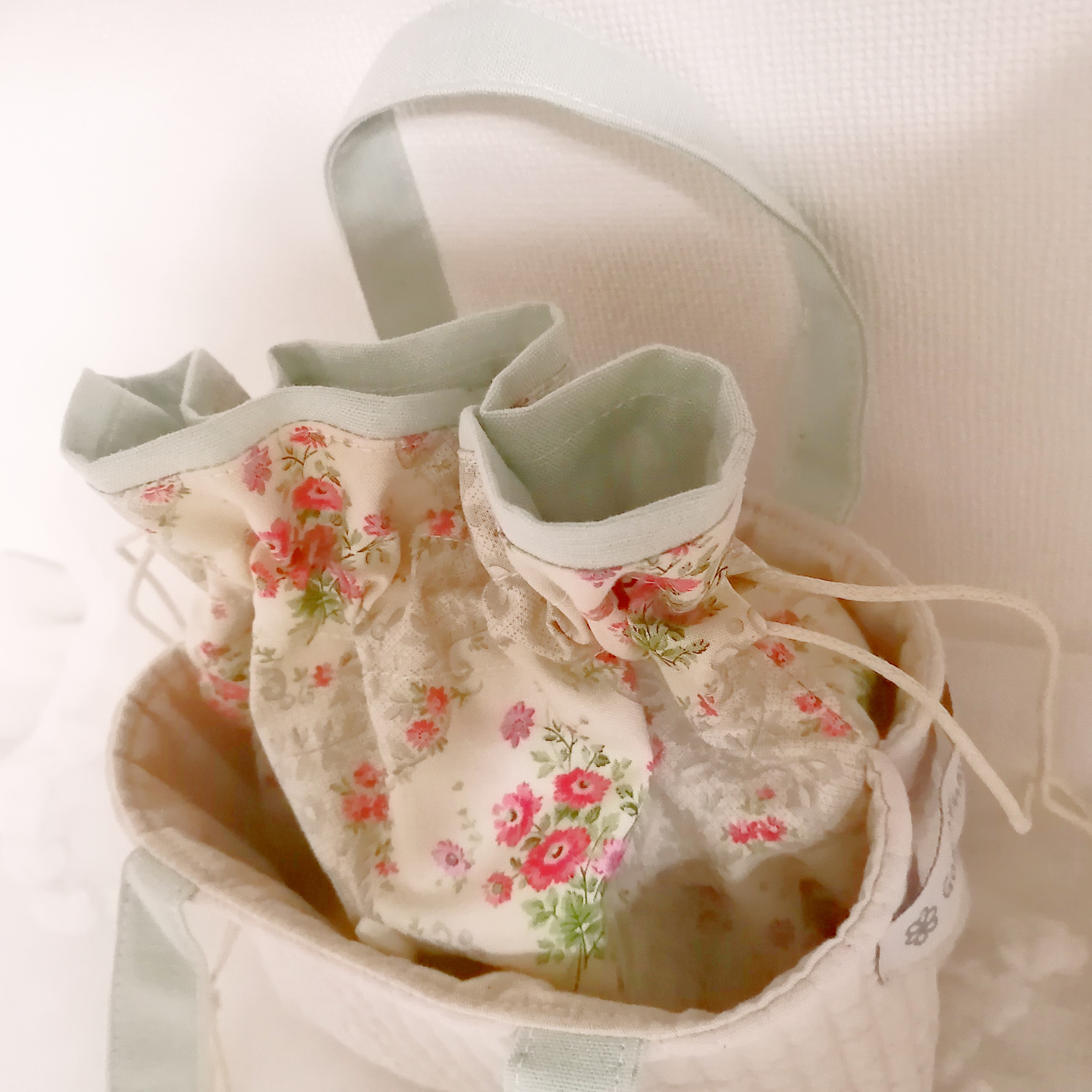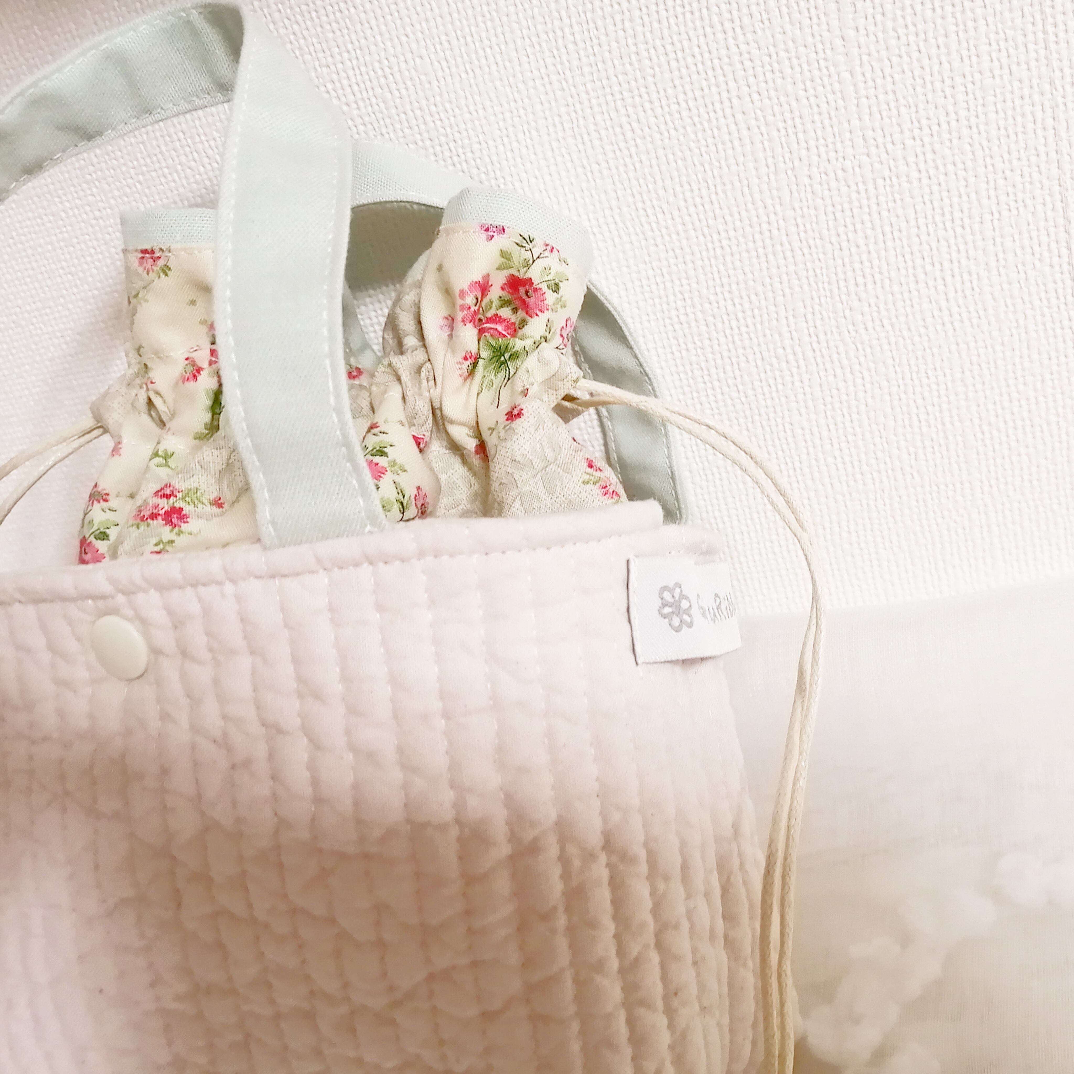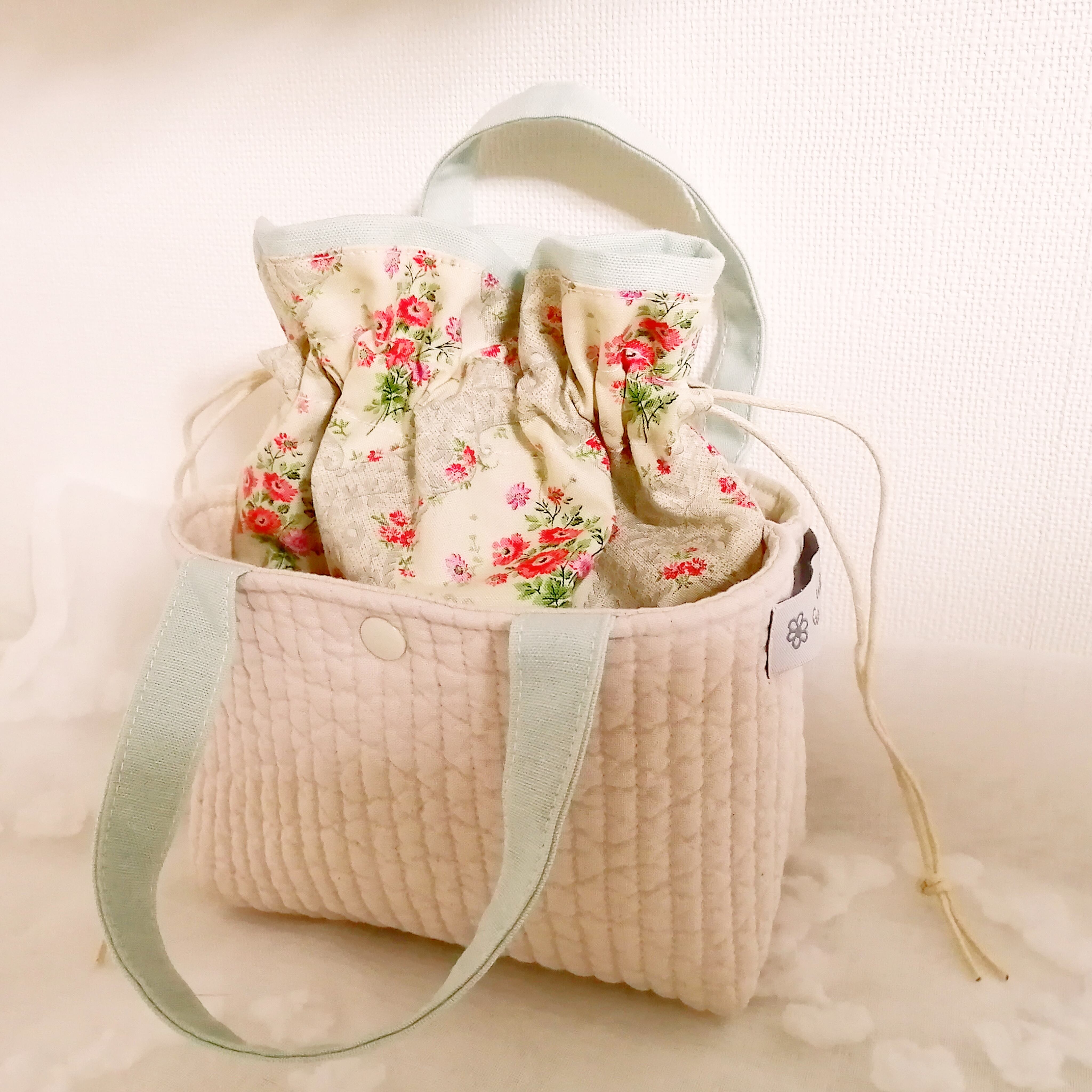 ヌビキルトのあおりポケット付き巾着ポーチ モスグリーン&赤いお花