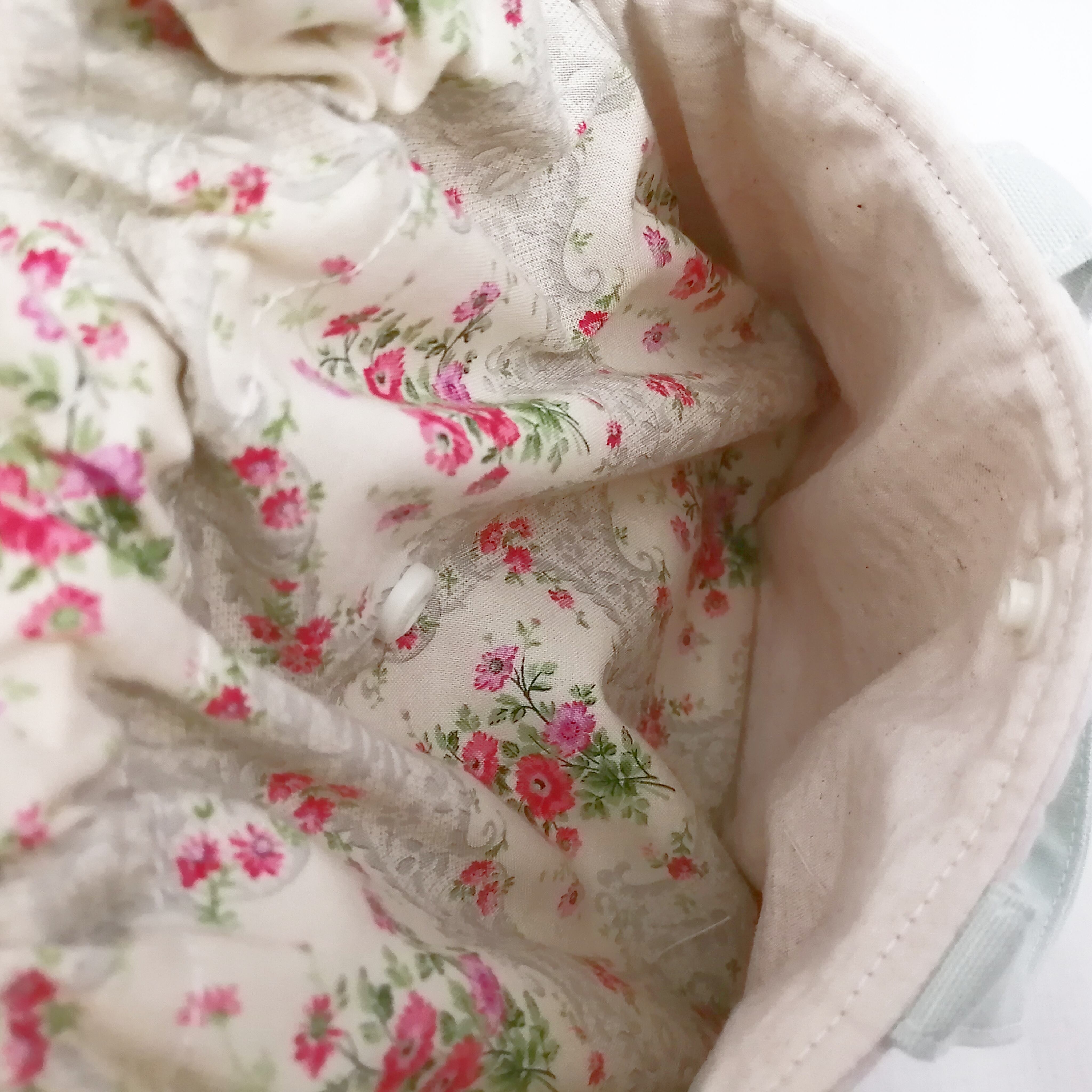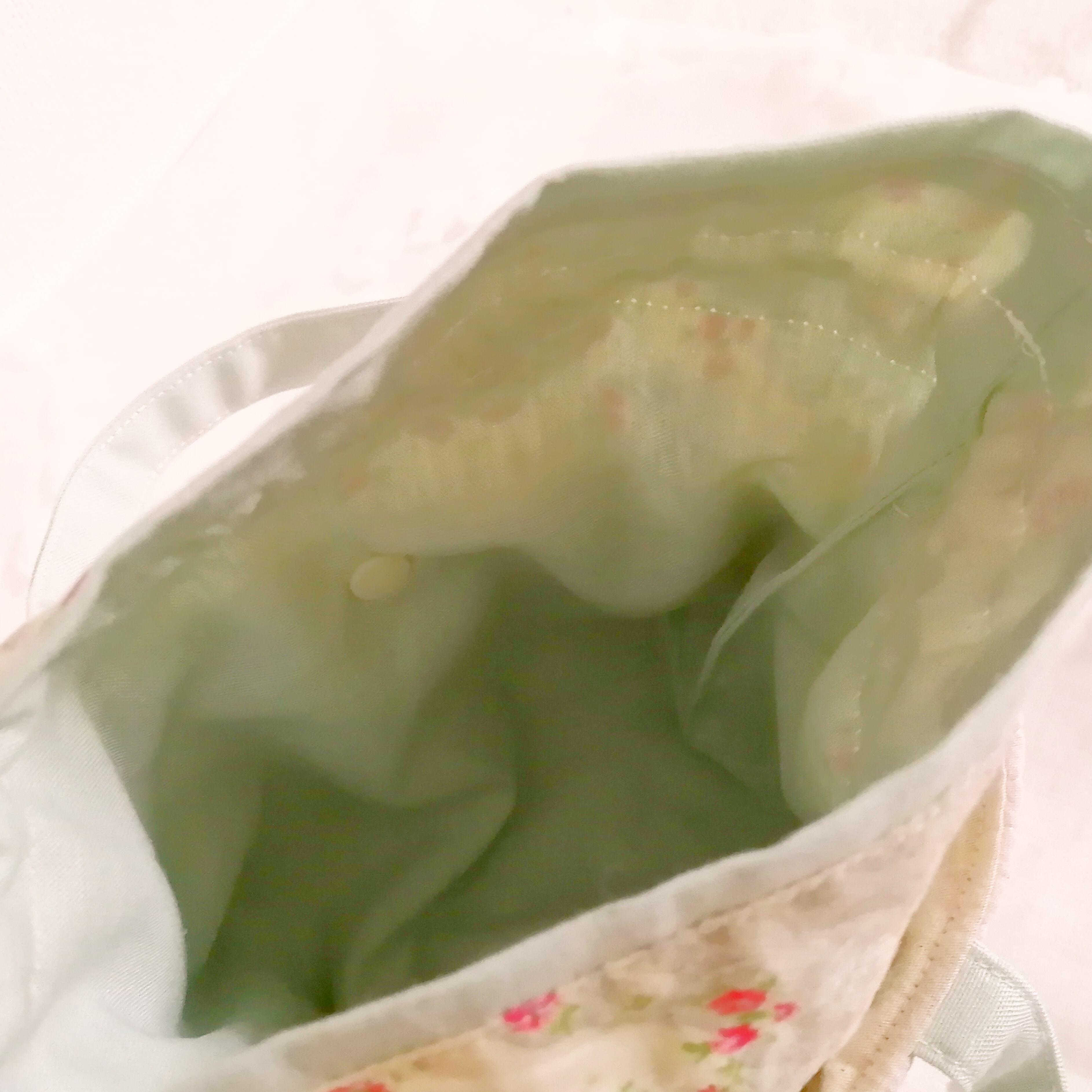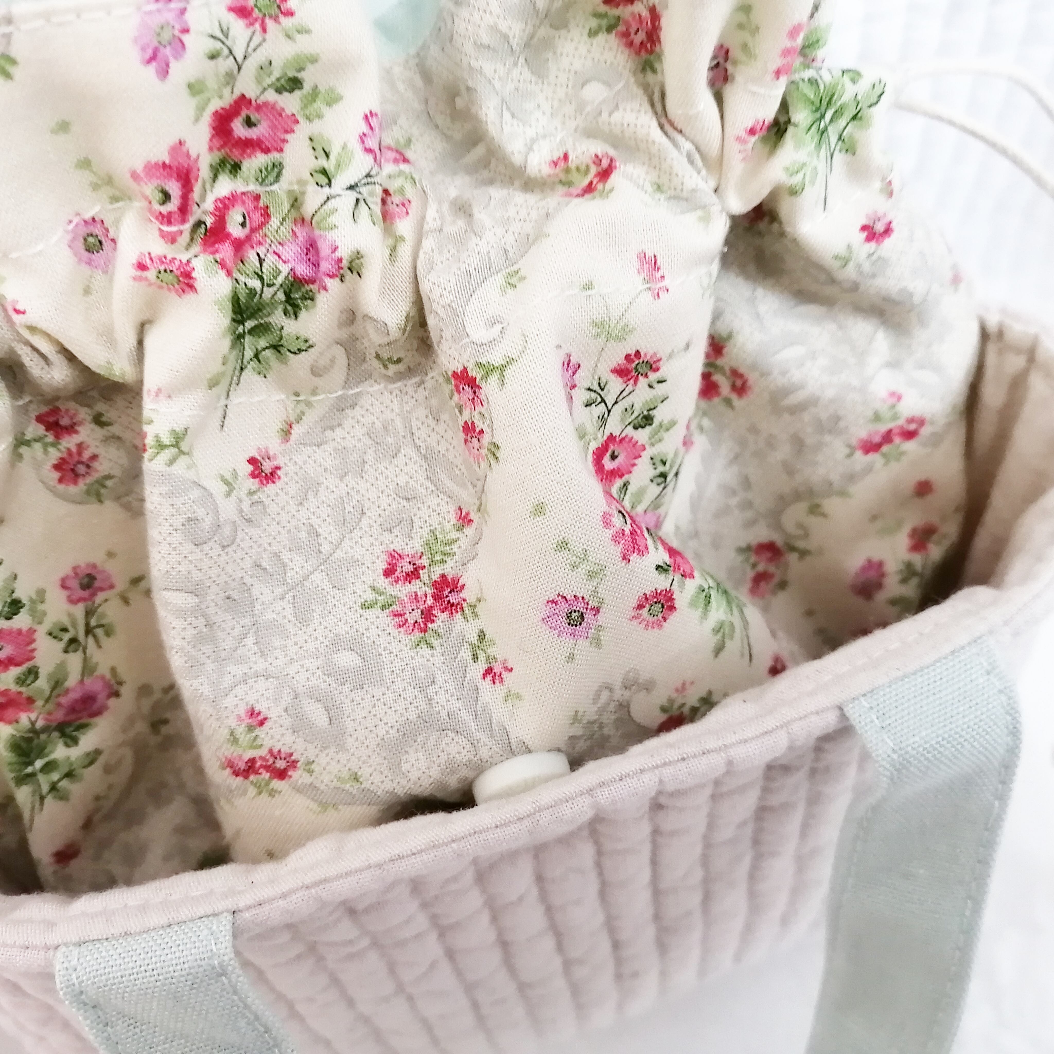 ヌビキルトのあおりポケット付き巾着ポーチ モスグリーン&赤いお花