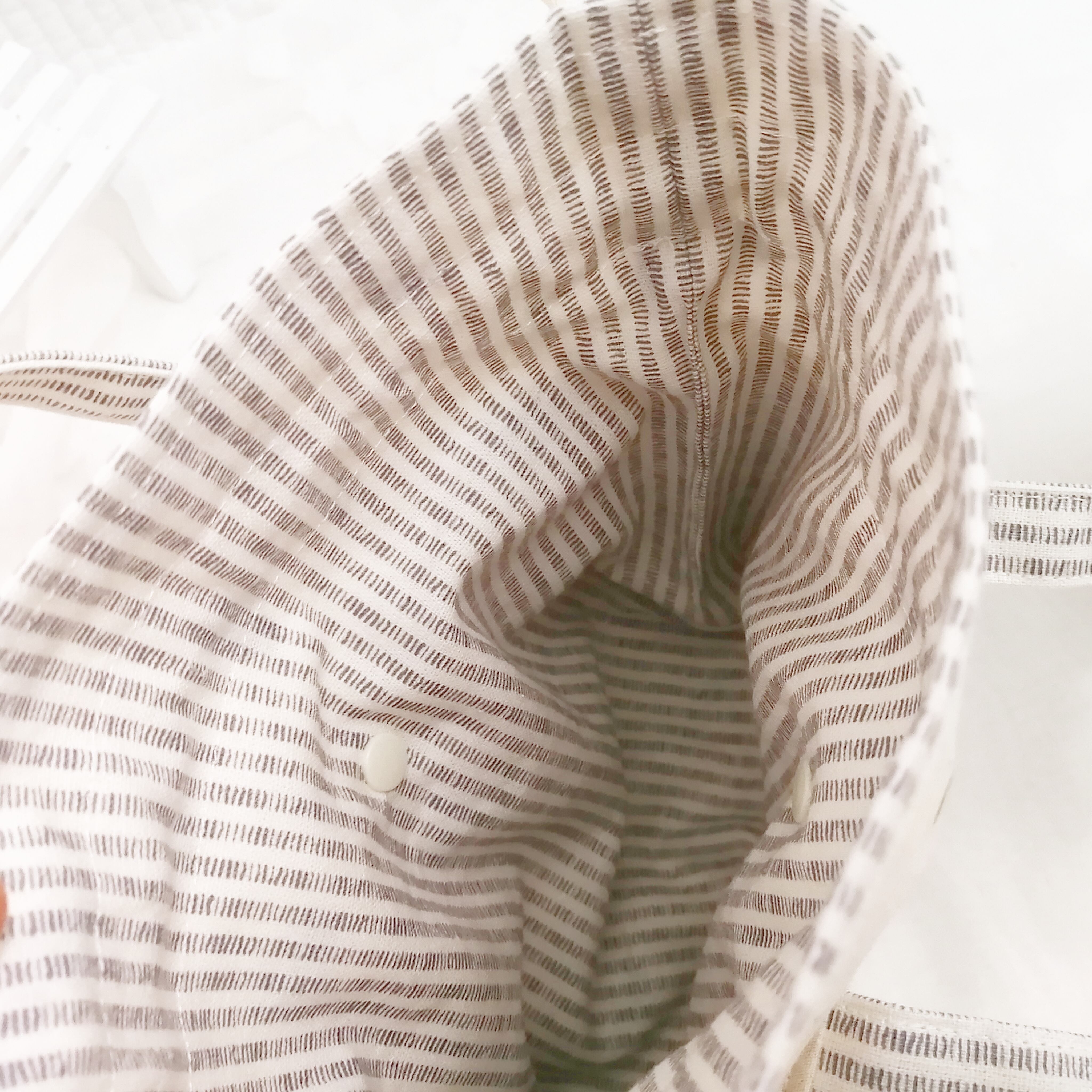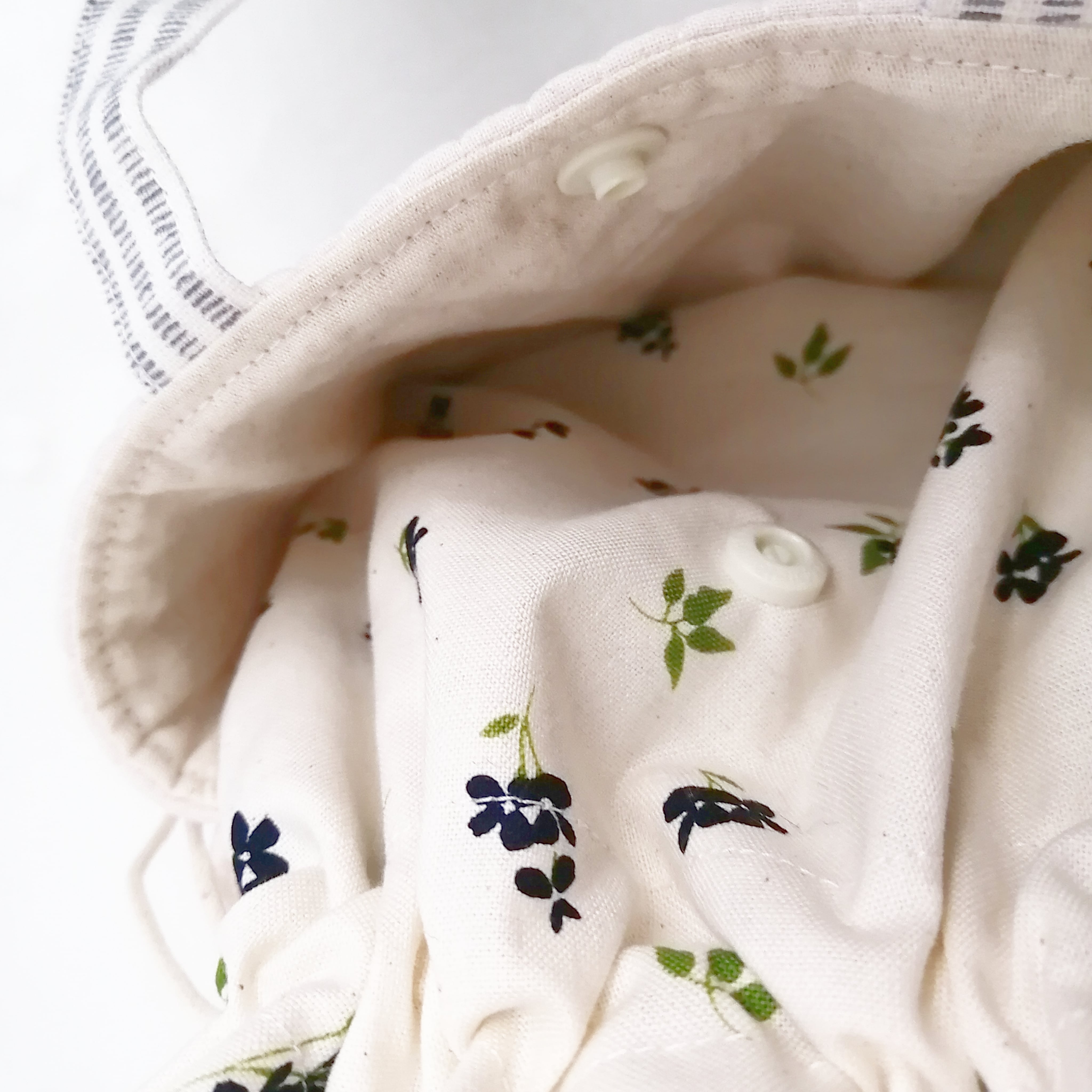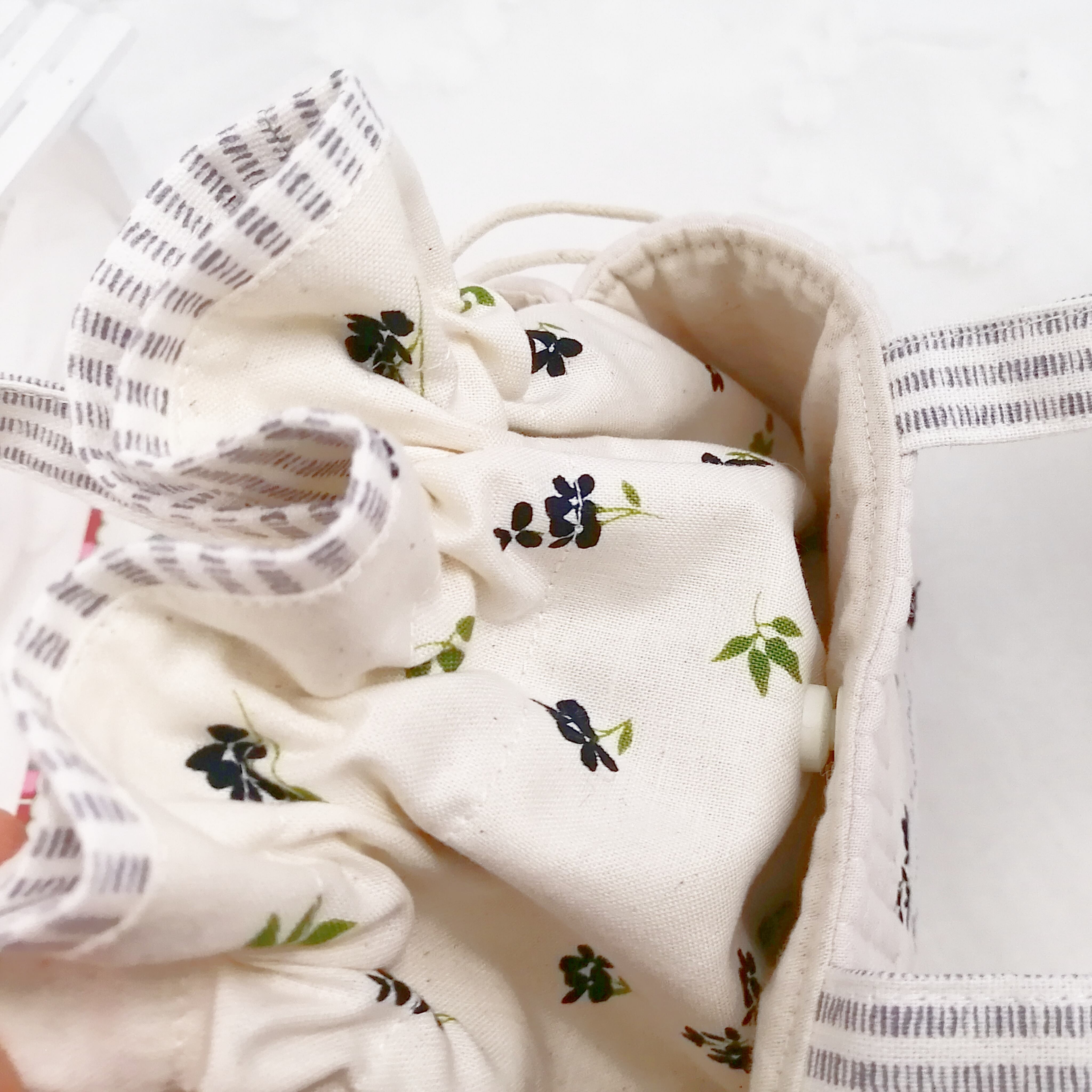 ヌビキルトのあおりポケット付き巾着ポーチ 紺色の小花 グレーストライプ デザインタグ
