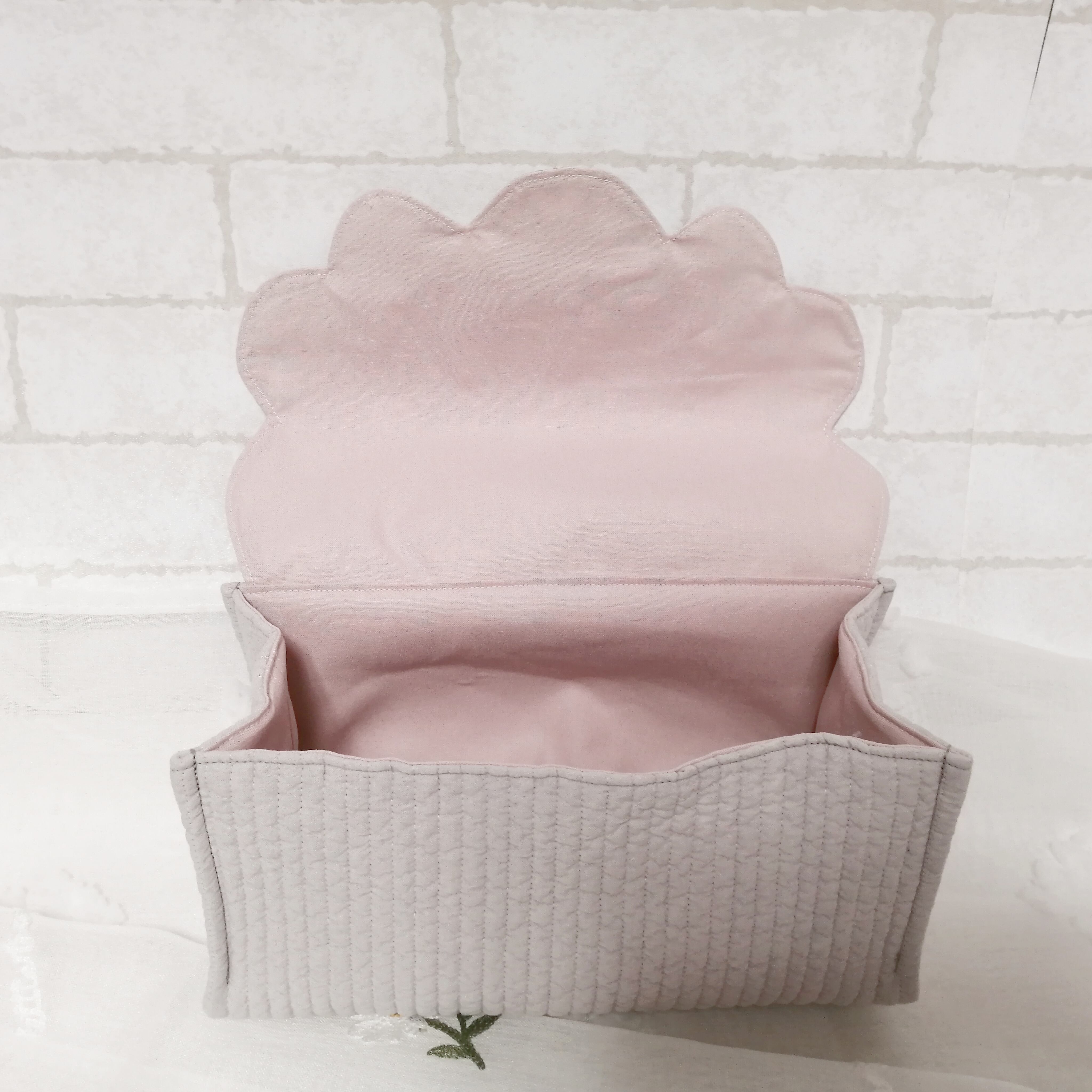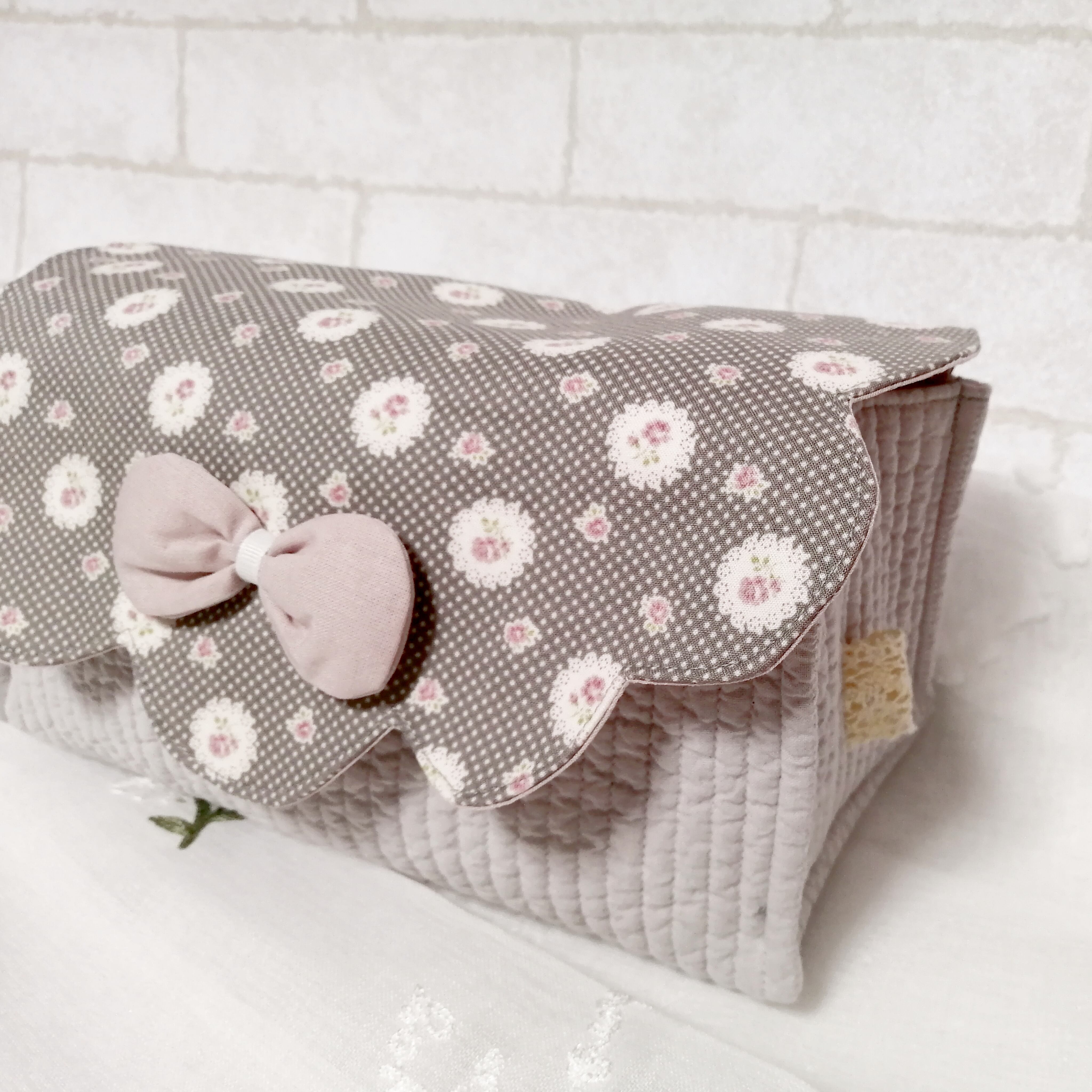 スカラップリボンの布バスケット ヌビ グレー花*花 くすみピンク無地のふわふわリボン