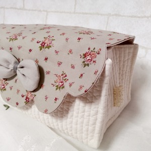 スカラップリボンの布バスケット ヌビ ベージュ花 グレー無地のふわふわリボン