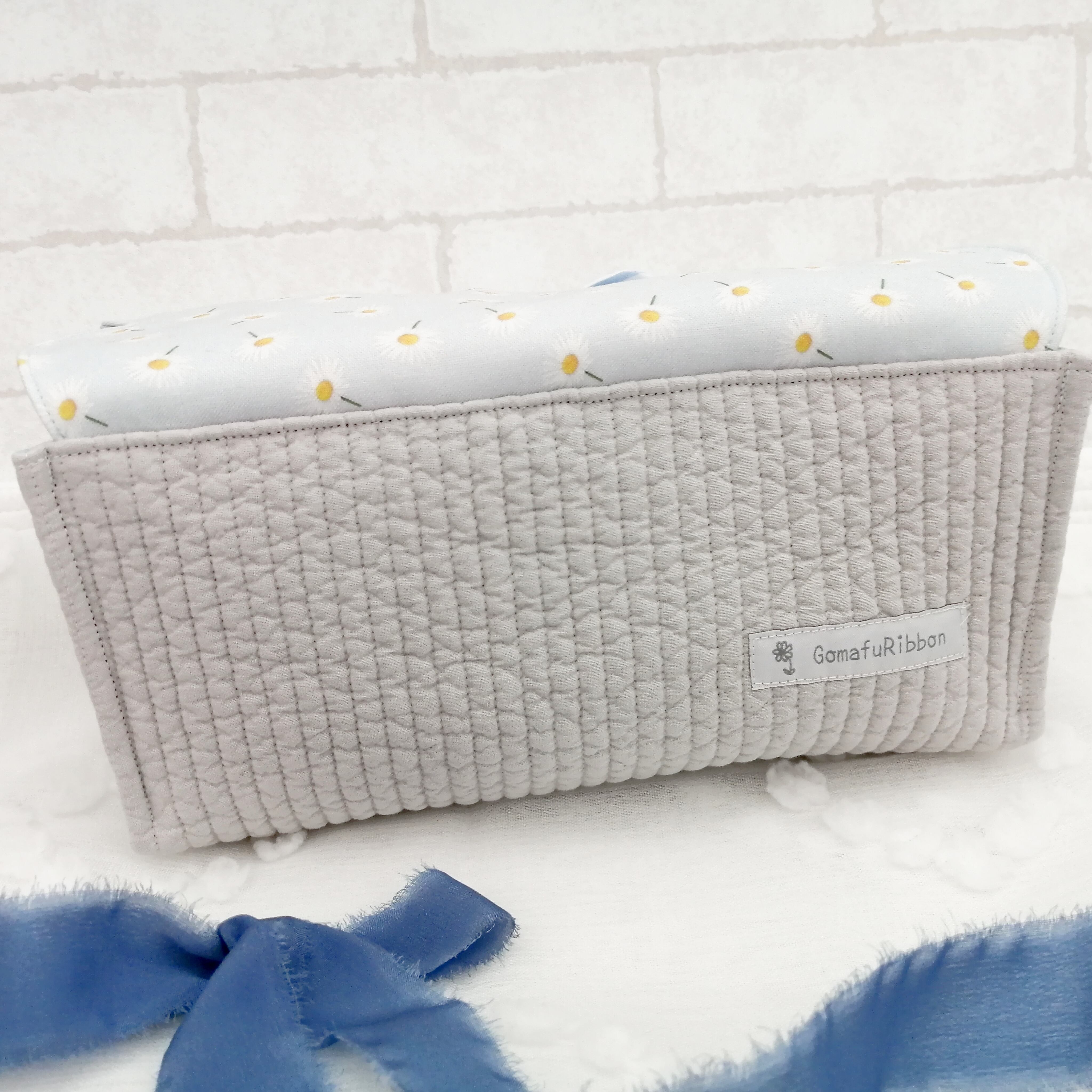 スカラップリボンの布バスケット ヌビ マーガレット 水色ストライプのふわふわリボン
