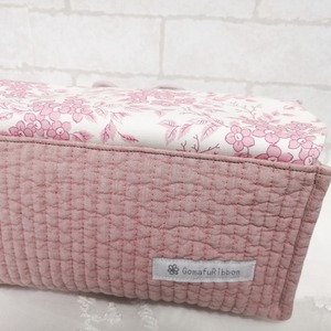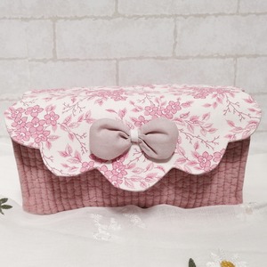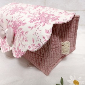 スカラップリボンの布バスケット ヌビ ピンクの花 くすみピンク無地のふわふわリボン