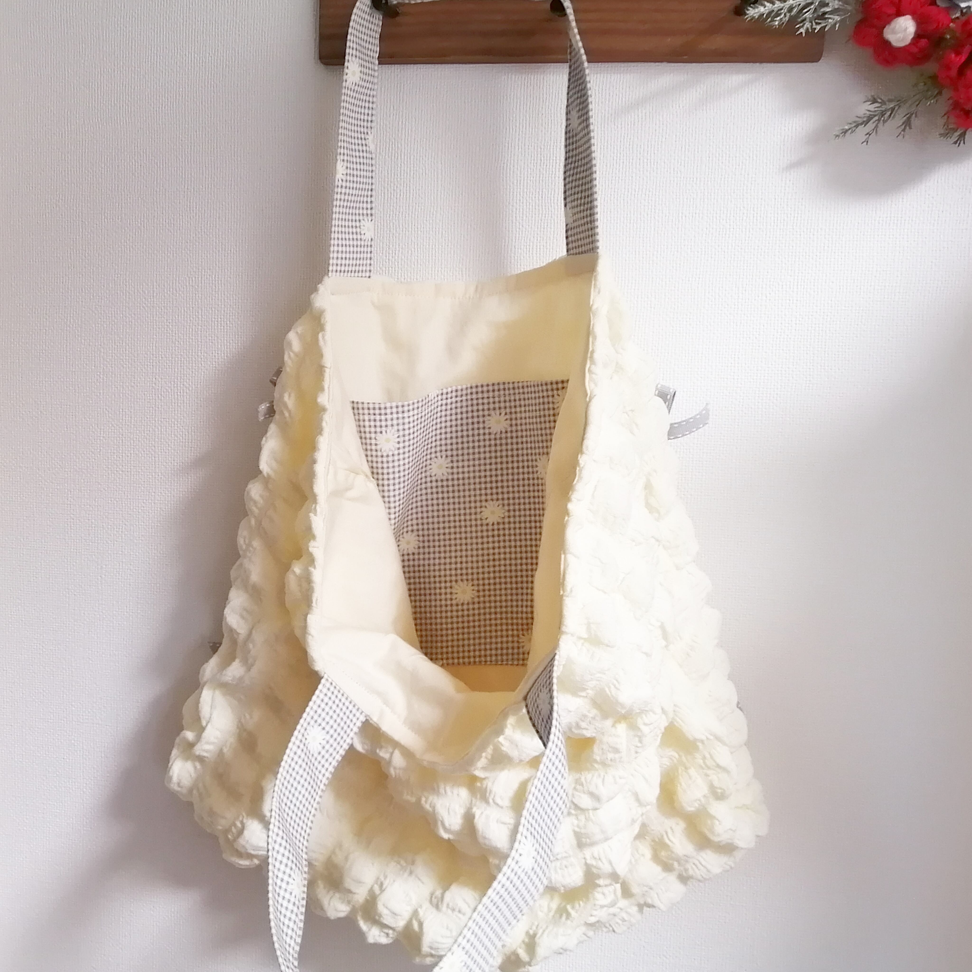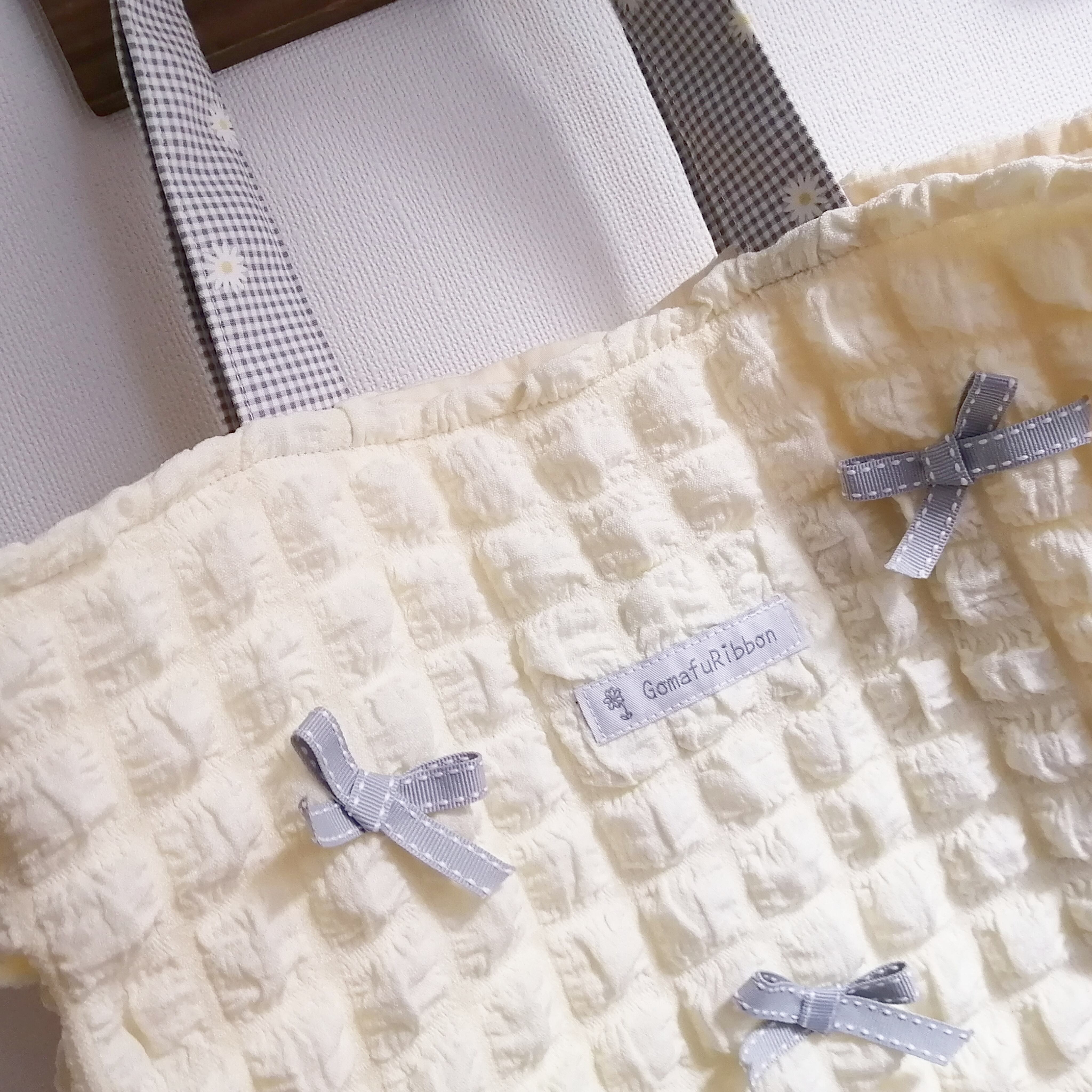 ポコポコリボントート アイボリー 持ち手グレーのギンガムにお花