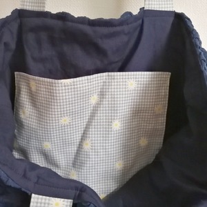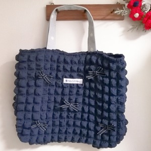 ポコポコリボントート 紺色 持ち手グレーのギンガムチェックにお花