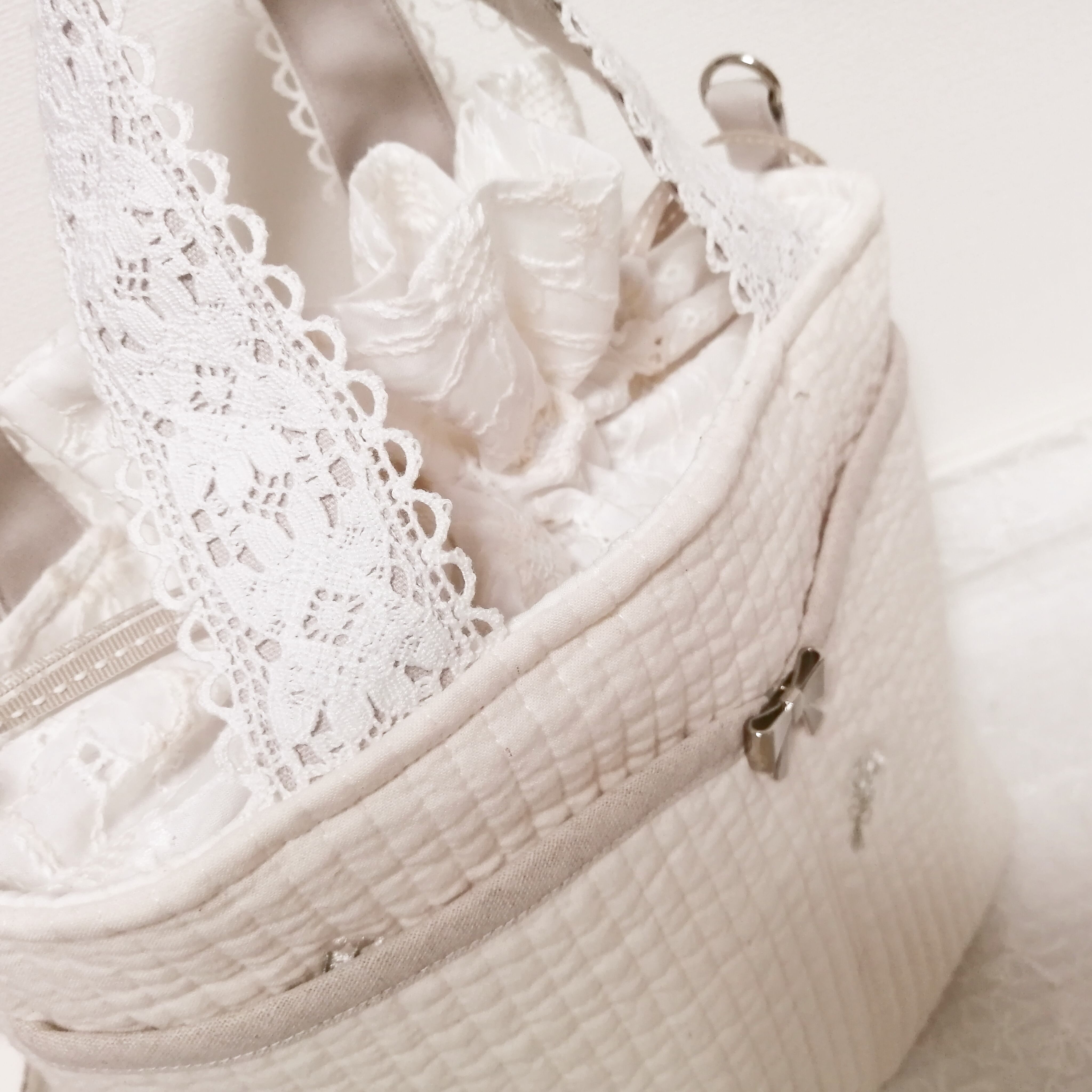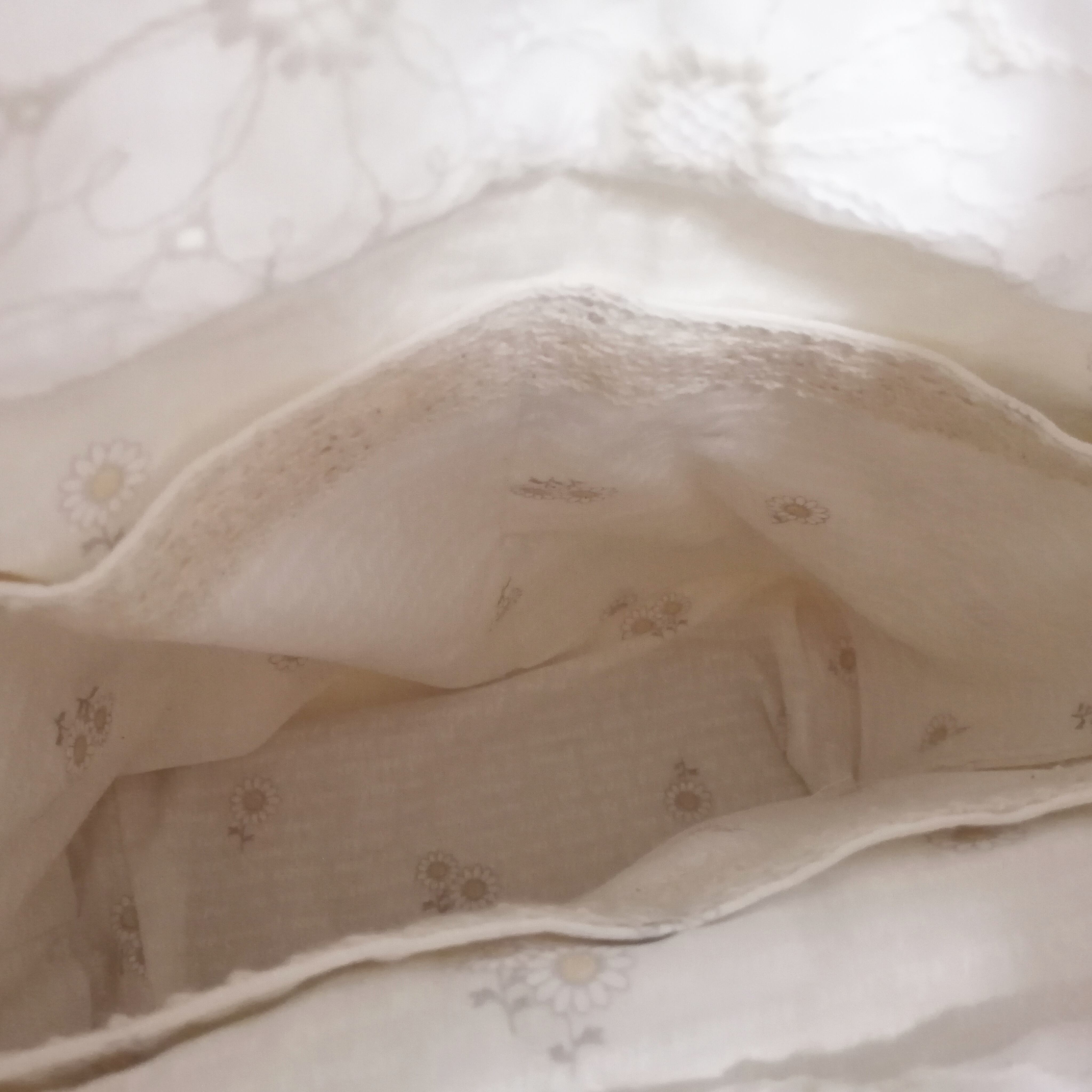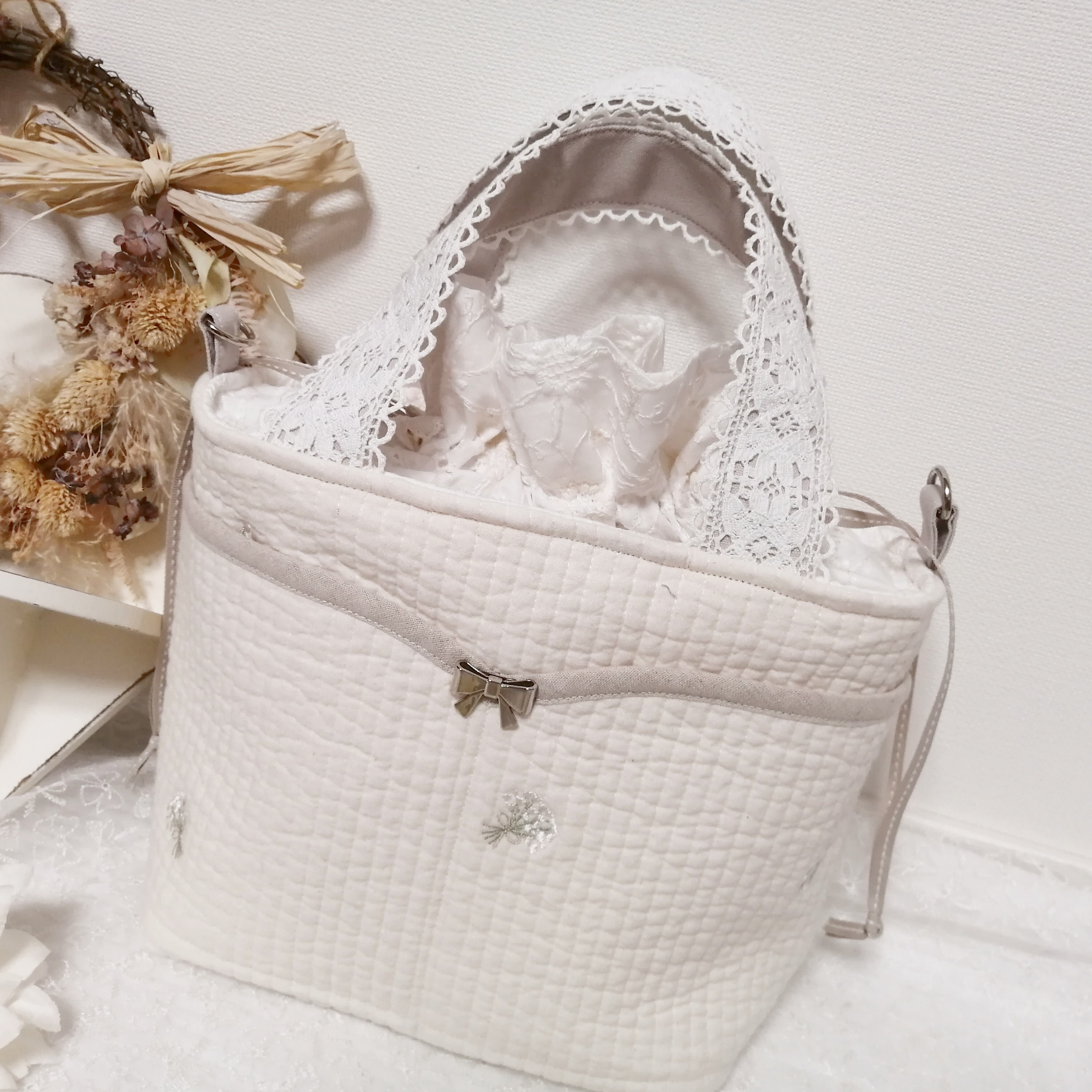 巾着の部分にはマーガレット刺繍のレース生地を使用