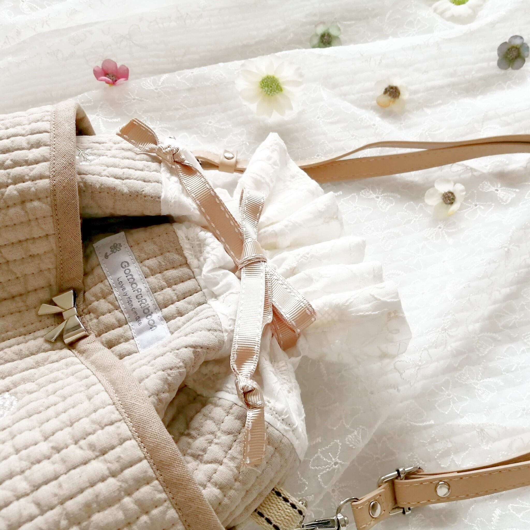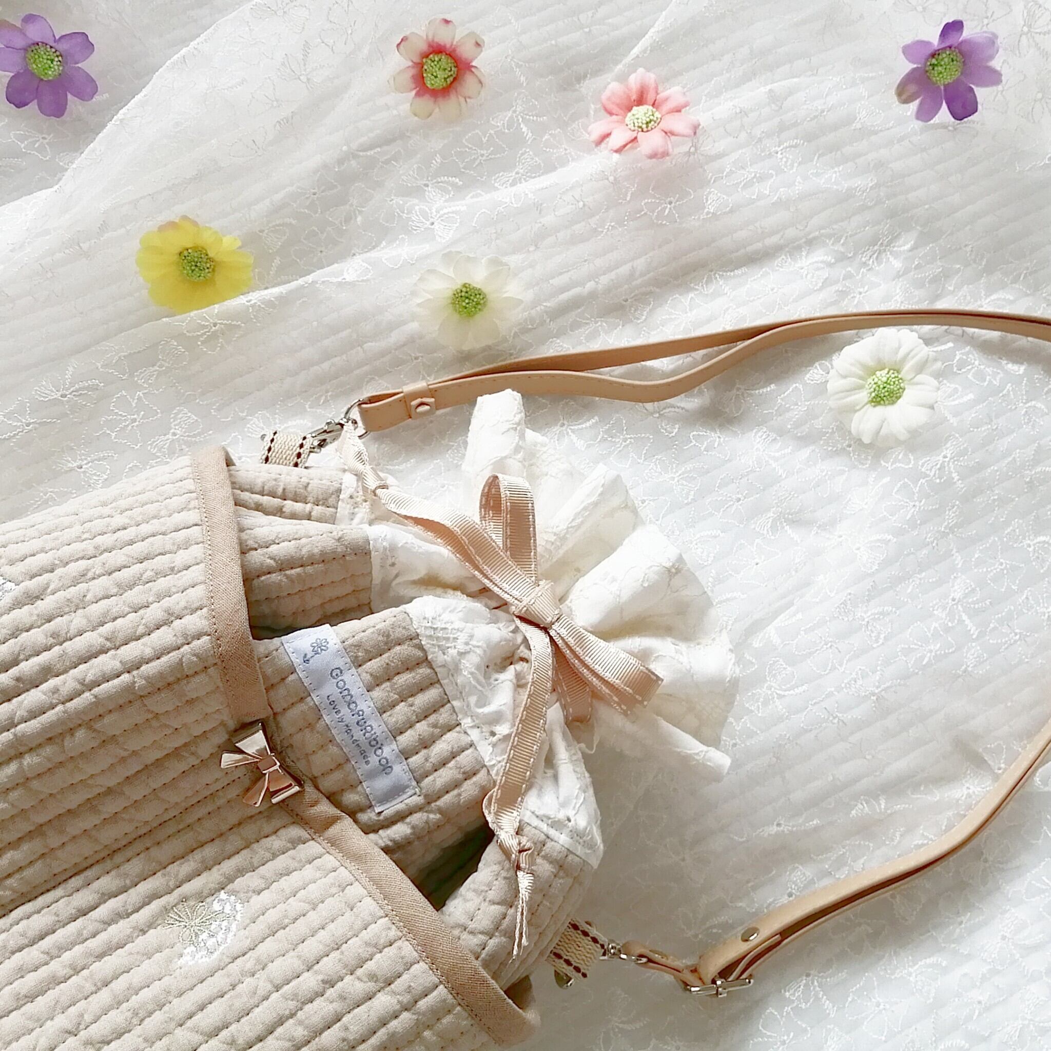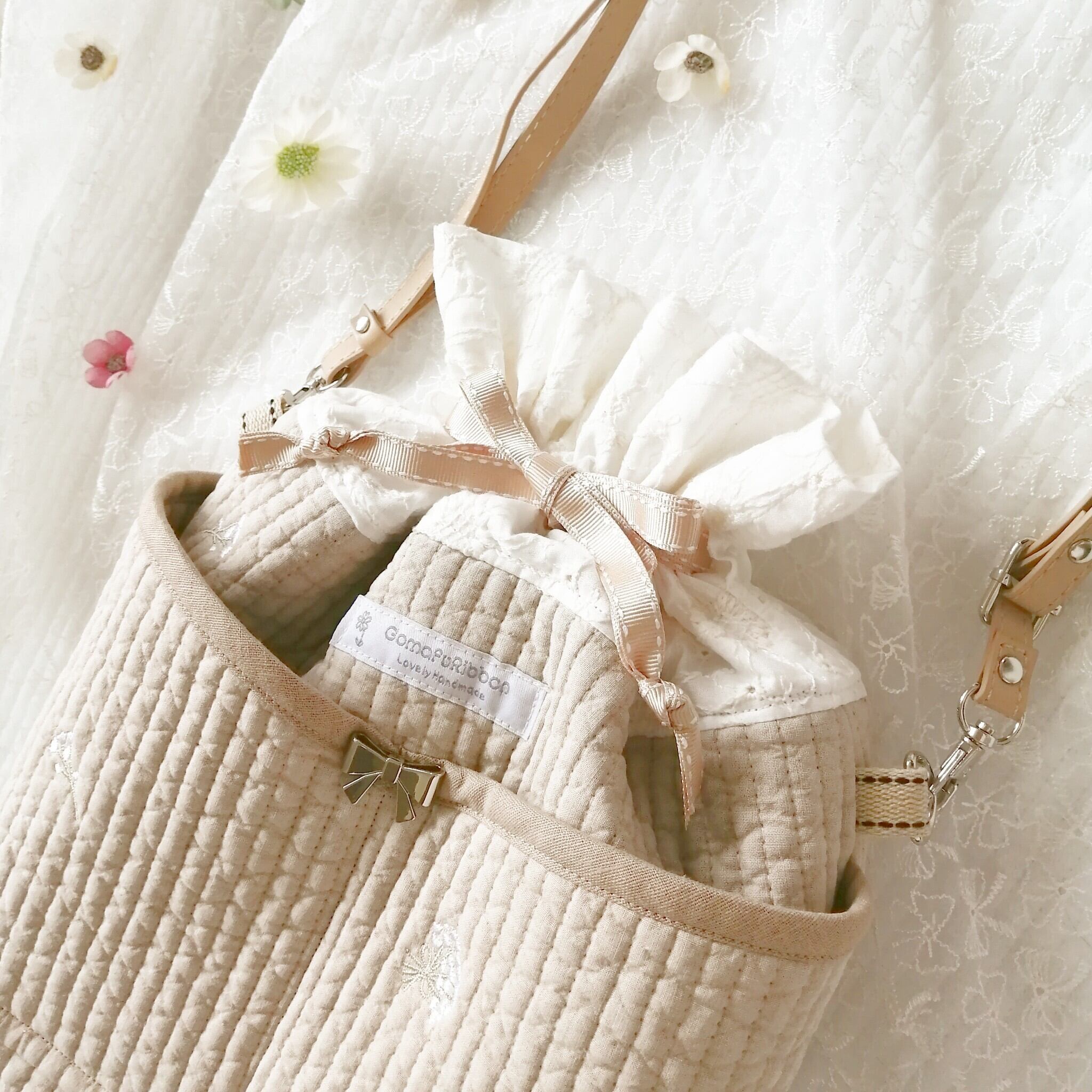 刺繍ヌビの斜めがけ巾着トート 優しいベージュ カスミソウの刺繍 ストラップ付