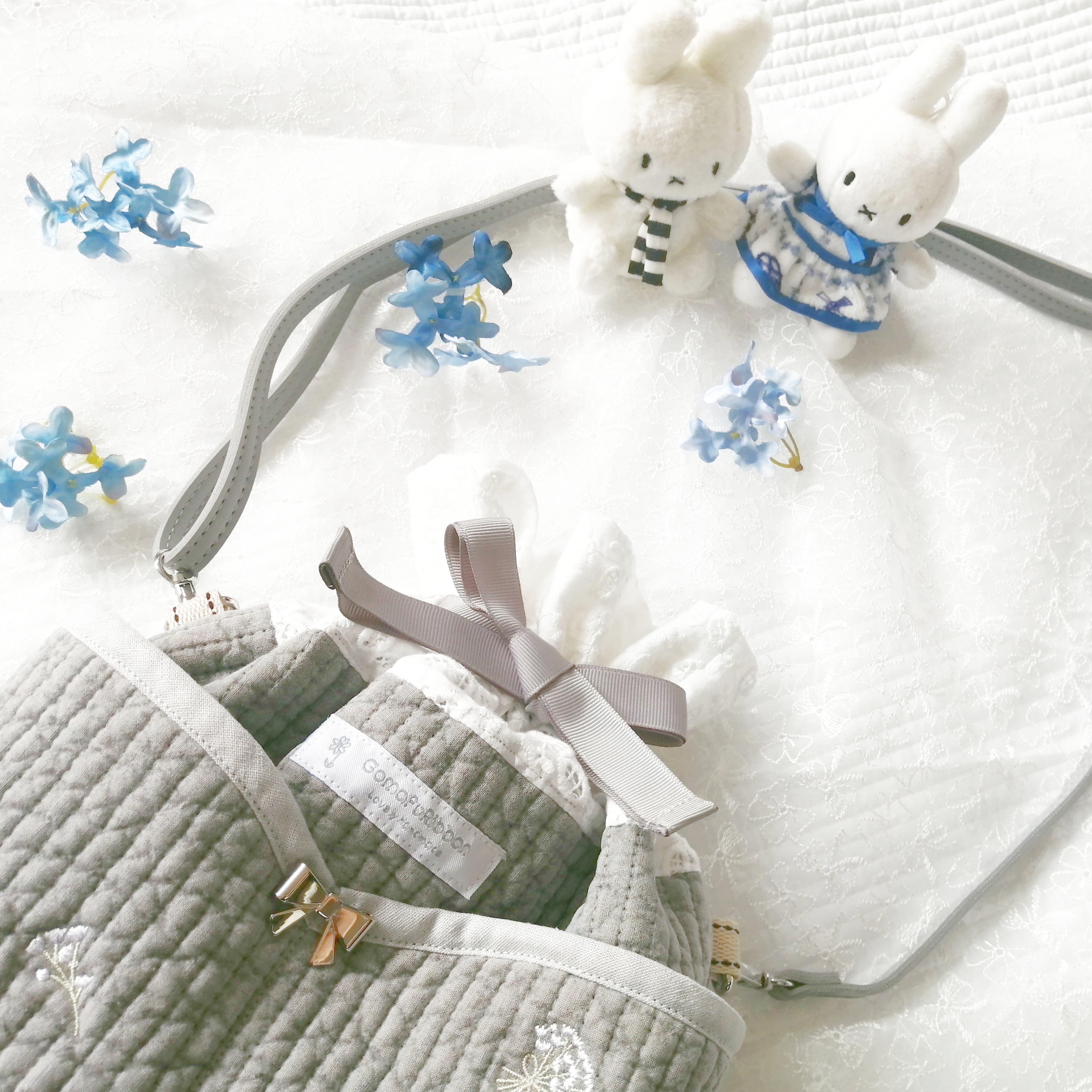 刺繍ヌビの斜めがけ巾着トート 爽やかグレー カスミソウの刺繍 幅広めのリボン ストラップ付